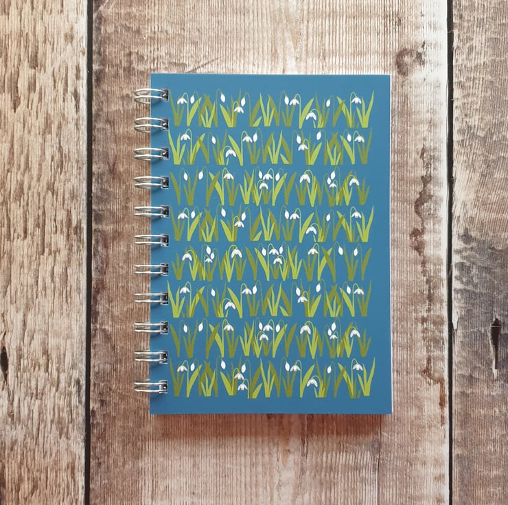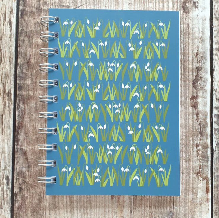 An A6 size hand-bound wire notebook featuring digitally draw snowdrops on a deep blue background.