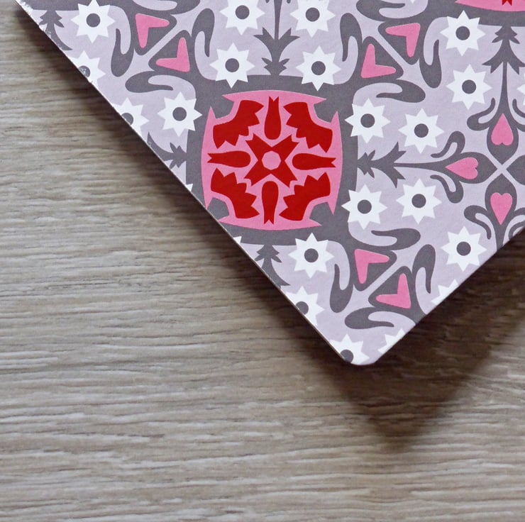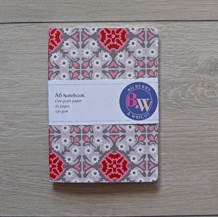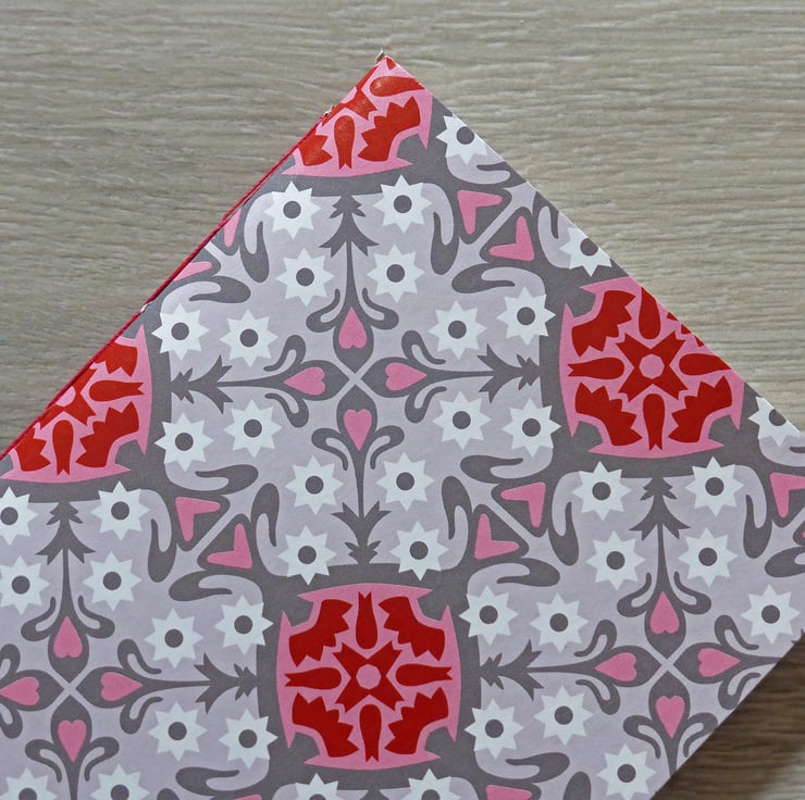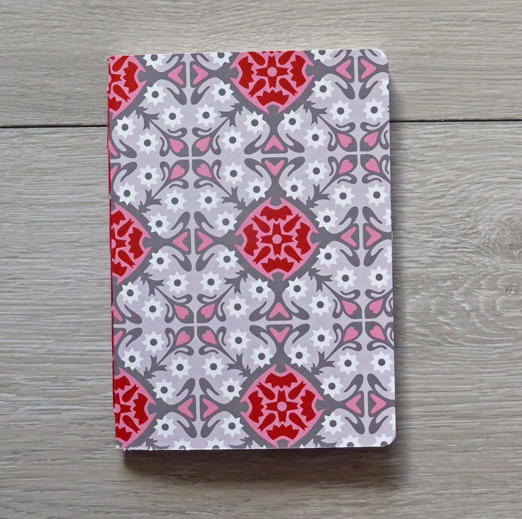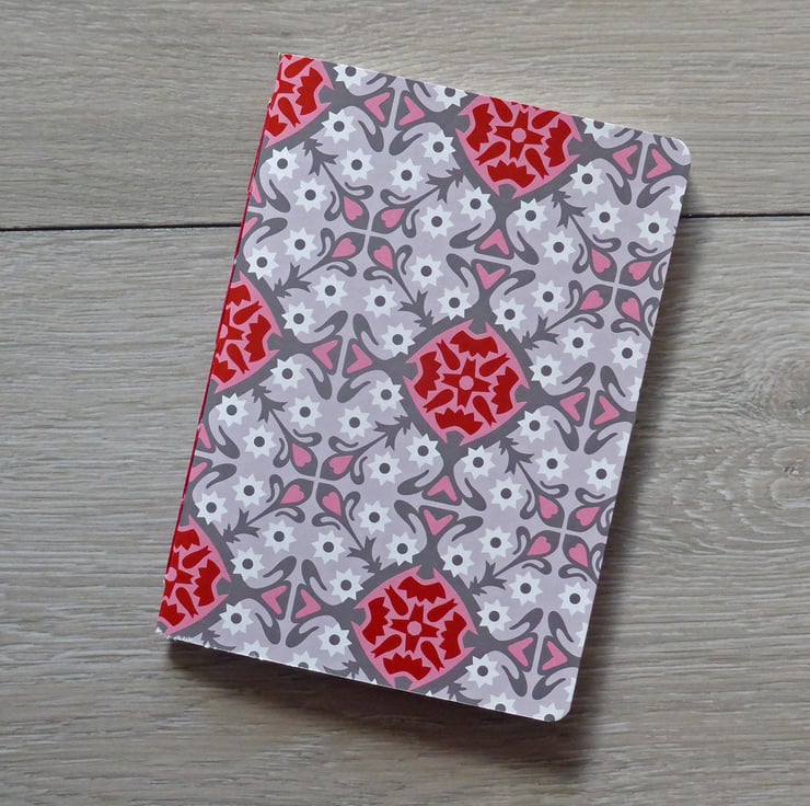 A handmade A6 notebook, with a decorative geometric pattern in pink, red and grey, made up with fine grain acid-free paper cut to size and stitched together with a traditional handstitched chain stitch linen thread binding.