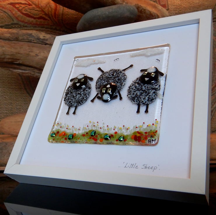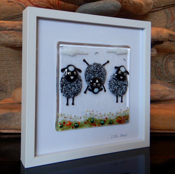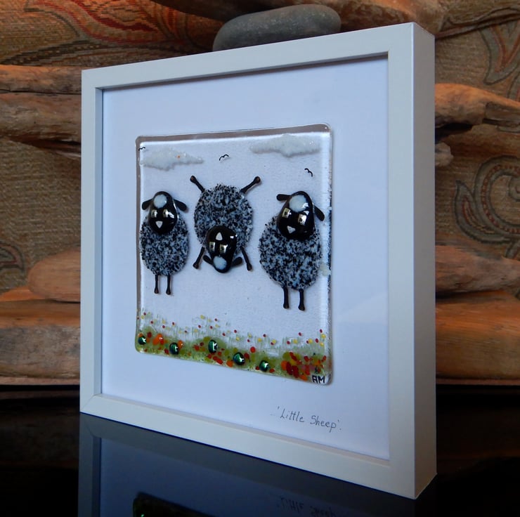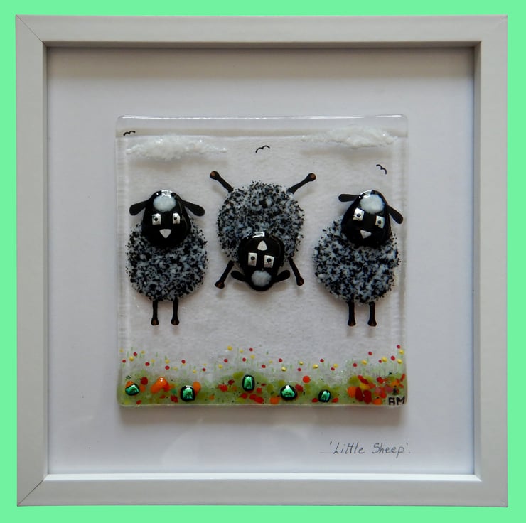 ''Sheep'' is made completely from glass which has been fused in my kiln. There is no enamel, glass paint or any other materials used; this picture is 100% pure bullseye fusing glass!