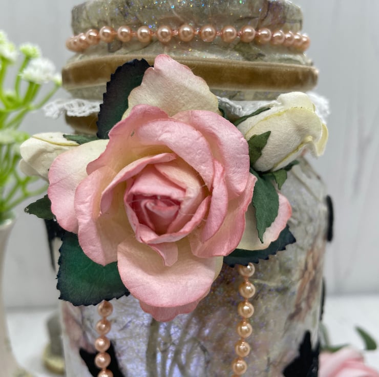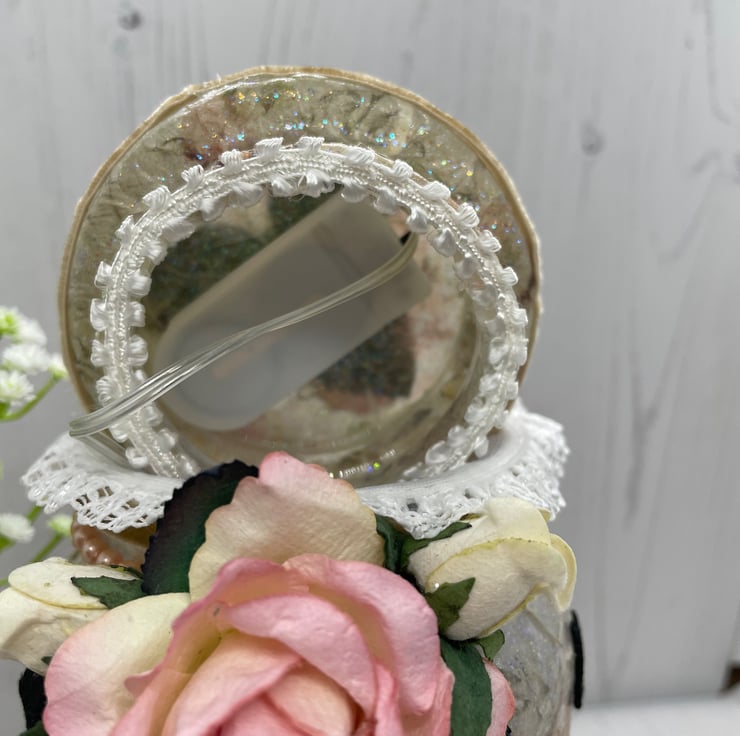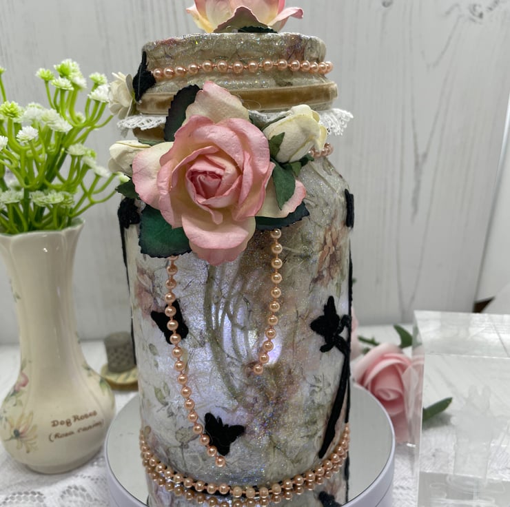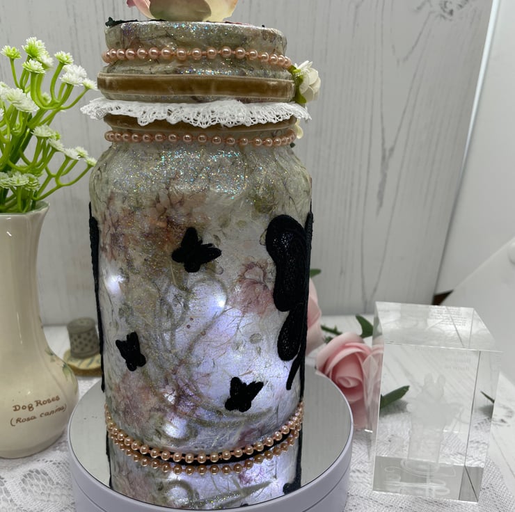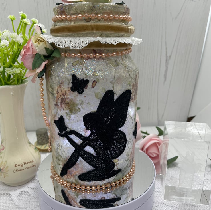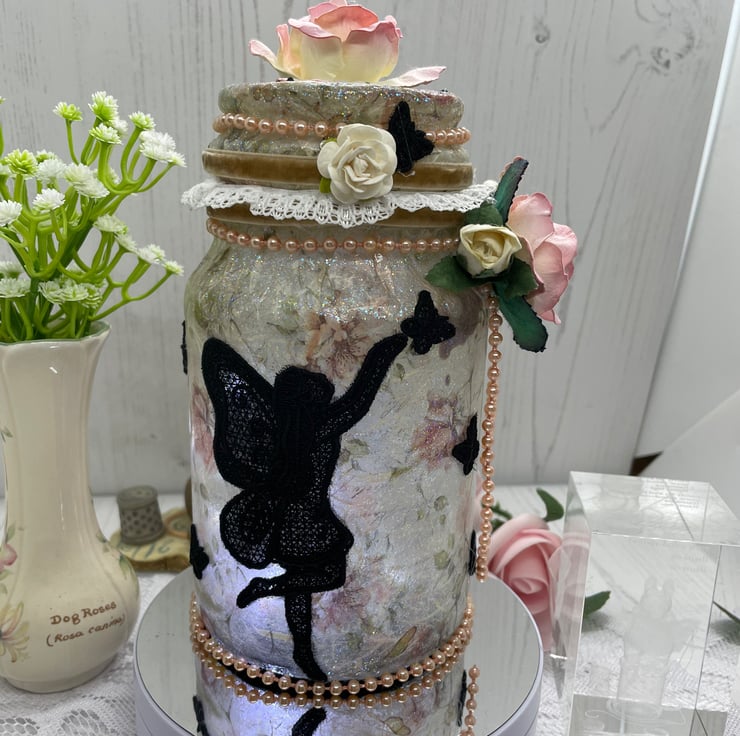 Upcycled coffee jar and lid, decoupage with rose rice paper, glitter glaze. Machine embroidered fairies and butterflies added as silhouettes round the outside. Roses and pearls to decorate. The lights are a string of seed lights with the on/off switch attached to the lid with hook and loop to make switching on and off and changing batteries easier.