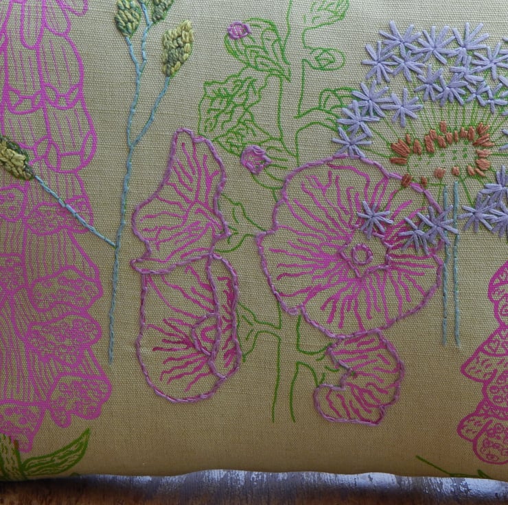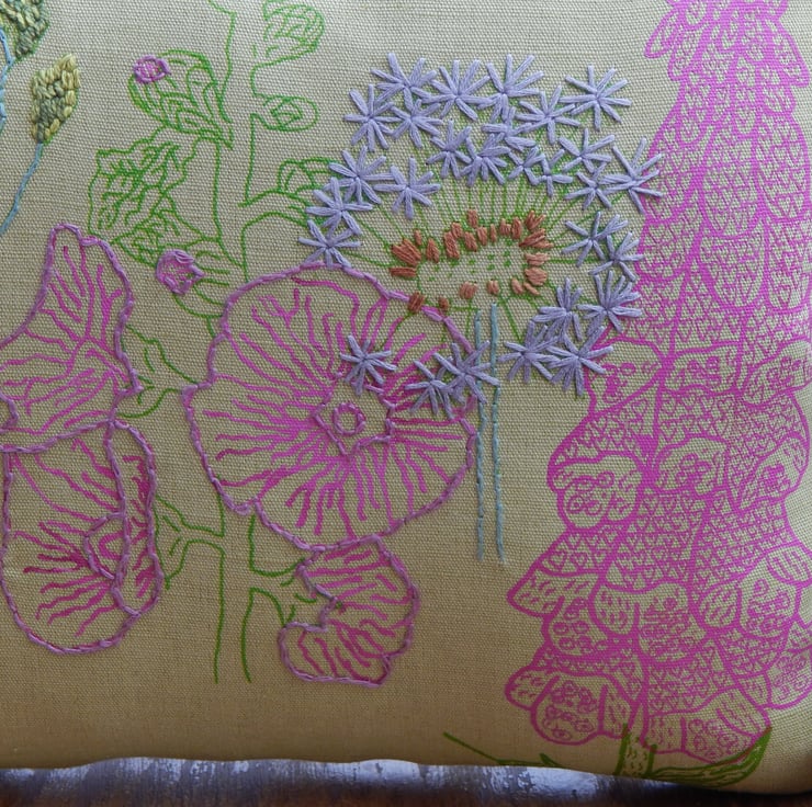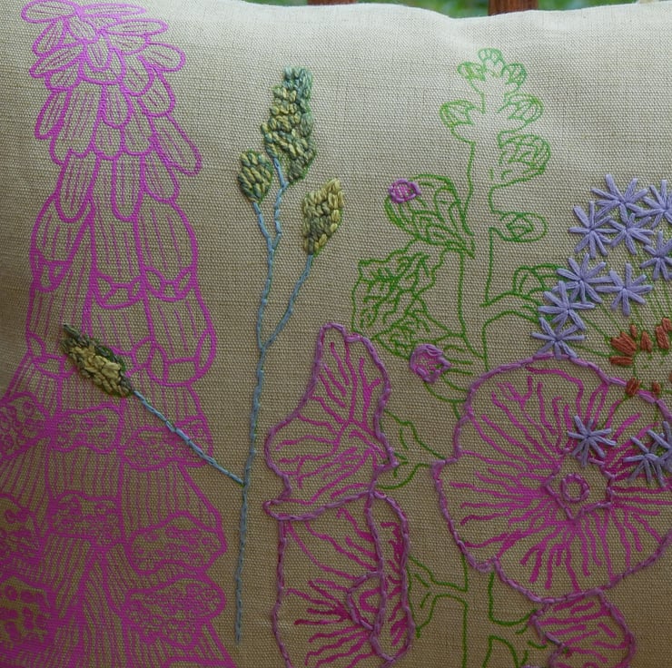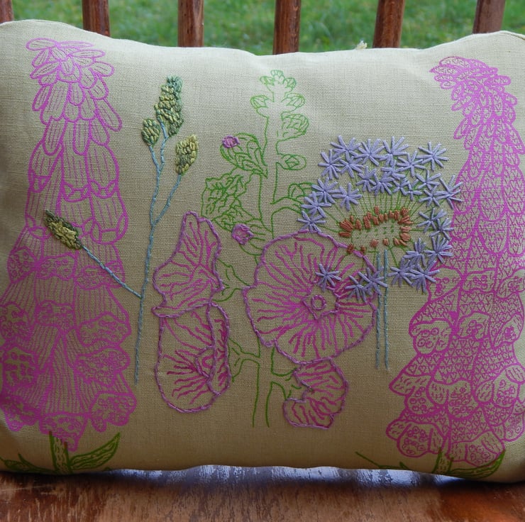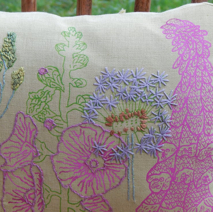 This is a light green, linen cushion that has been screen printed with my own wild flower designs. There are light magenta pink foxglove in 2 designs and a mallow. There is also a dandelion clock and wild grass which have been screen printed in green and hand embroidered. The edge of the mallow petals have also been hand embroidered.