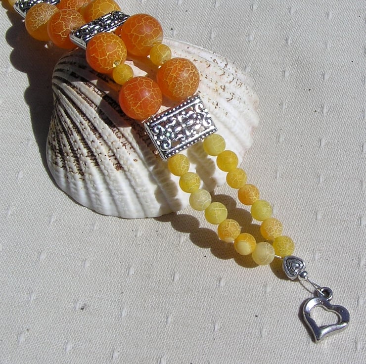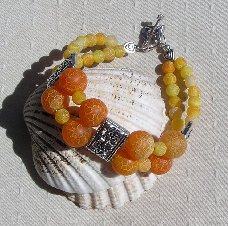 This Stunning Bracelet is made wholly from Frosted Bright Orange Agate round beads of various sizes… each section separated by an ornately decorated Tibetan Silver Bar Spacer - a Beautiful bright chunky combination that will look stunning either worn casually or with something more Elegant for a Special Evening out