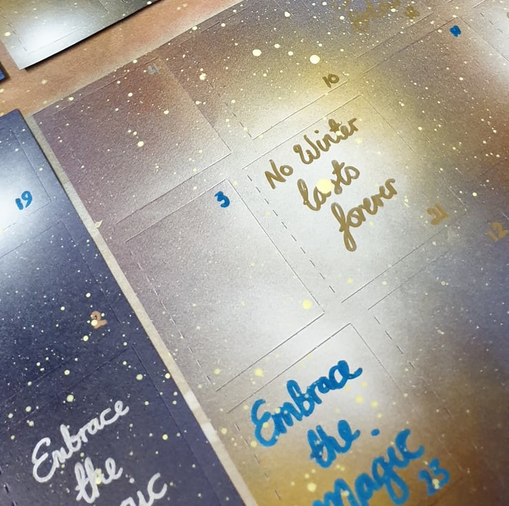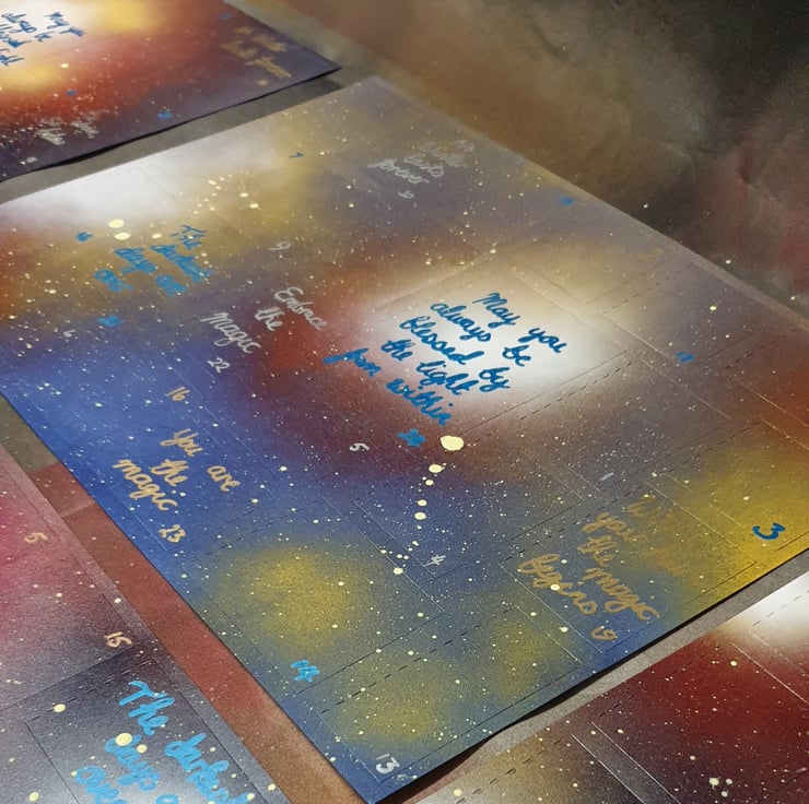 Featuring 24 original linocuts, the front cover pictures an interstellar nebula and quotes inspired by wicca, paganism and the turning of the wheel. Handmade an each one is unique.