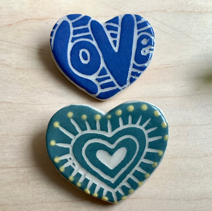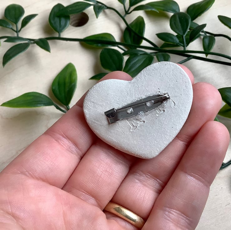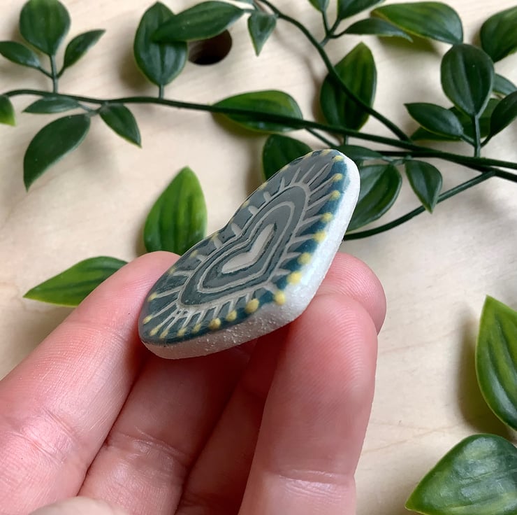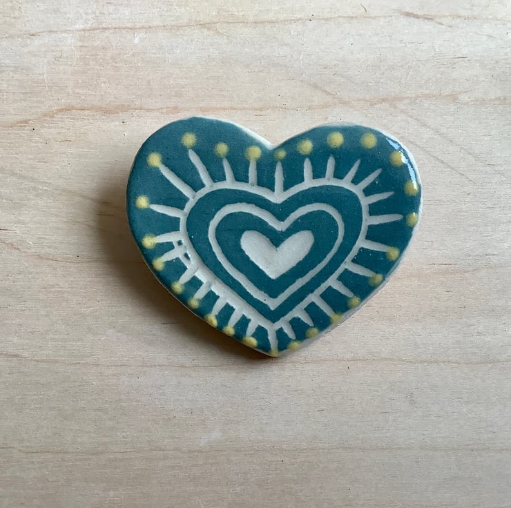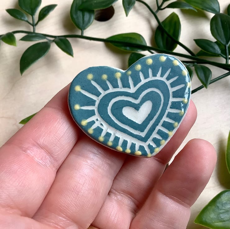 Little green heart brooch, with metal pin back. Made from stoneware clay and decorated using the sgraffito technique, where the design is carved though coloured slip. Comes in a gift box. Message card can be added on request. Makes a beautiful and unique gift.