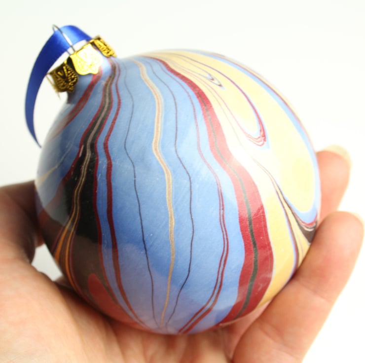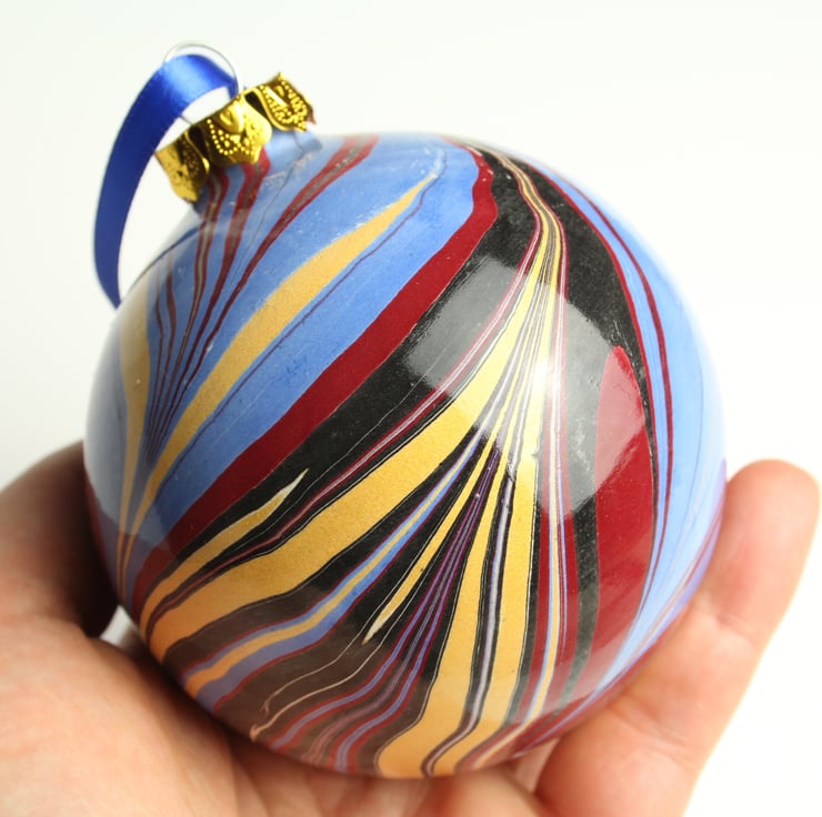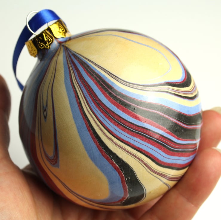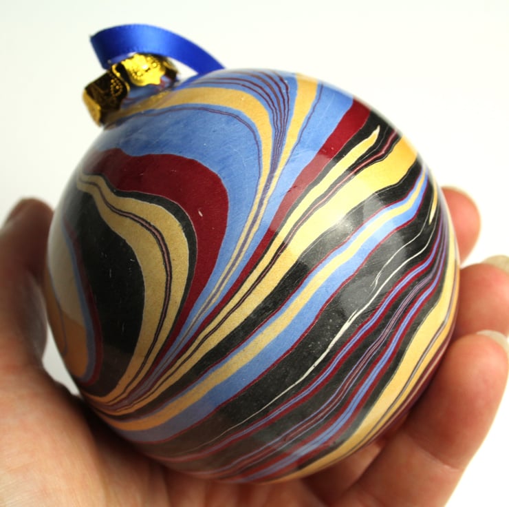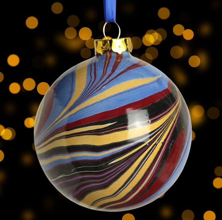 A fabulous luxury marbled ceramic bauble in a more traditional colour palette of deep red, blue, black, and gold in a chevron pattern..