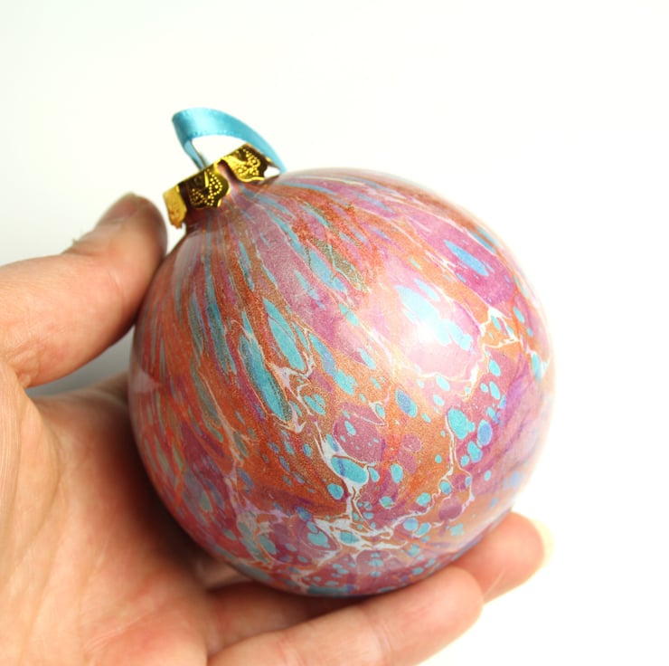 A fabulous luxury marbled ceramic bauble in metallic copper and pink with turquoise spots. Reduced due to a pattern fault shown in the third image.
