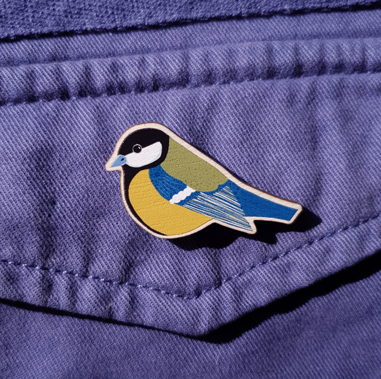 The birch plywood is digitally printed with my design before being laser cut. The pin comes on a backing card.