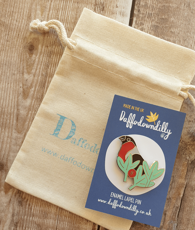A mini cotton drawstring bag, printed with Daffodowndilly branding, the perfect size to hold a bag charm, keyring, enamel brooch or wooden brooch. It also makes a lovely touch if you want to give any of these as a gift.
