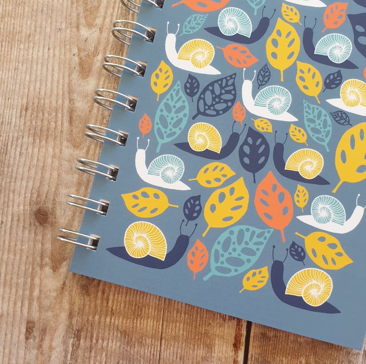 An A6 size hand-bound wire notebook with an illustrated design featuring snails and leaves.