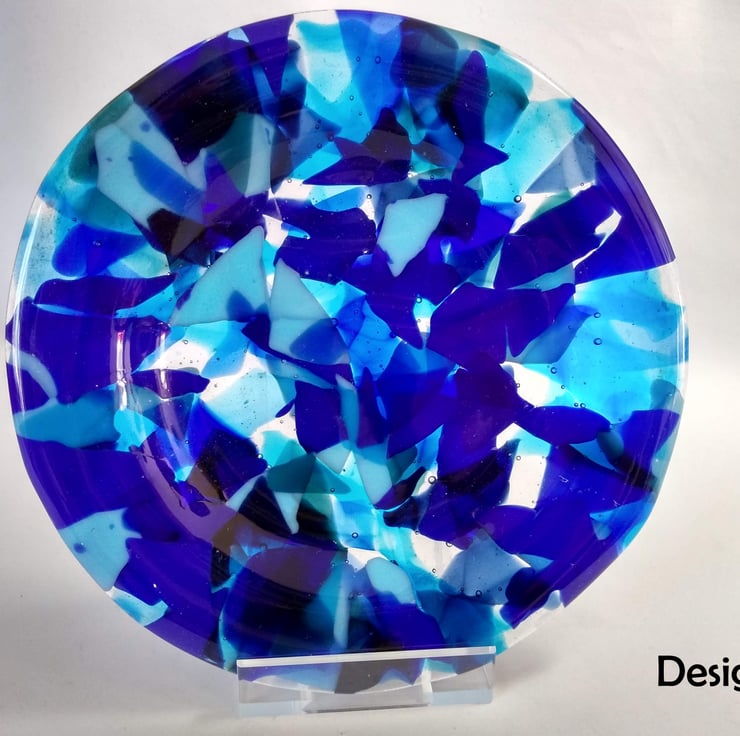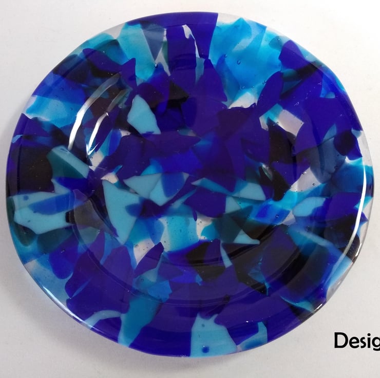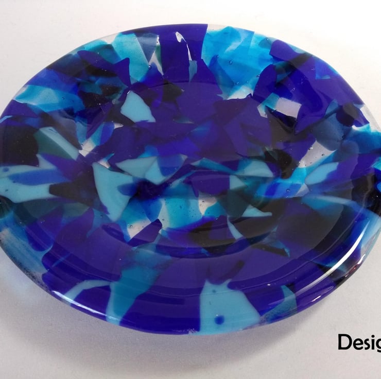 These abstract shallow bowl or plates are created from pieces of decorative glass in blues, turquoise, and purple, cast in a mould so that they melt together and then slumped into a bowl. The glass is thick, making a pleasingly heavy plate with an intriguing pattern.