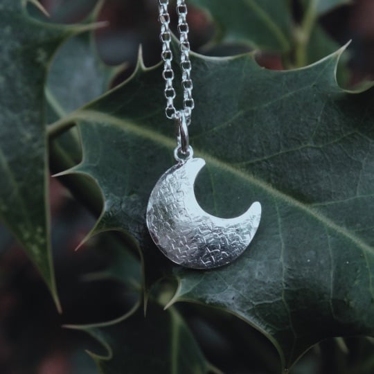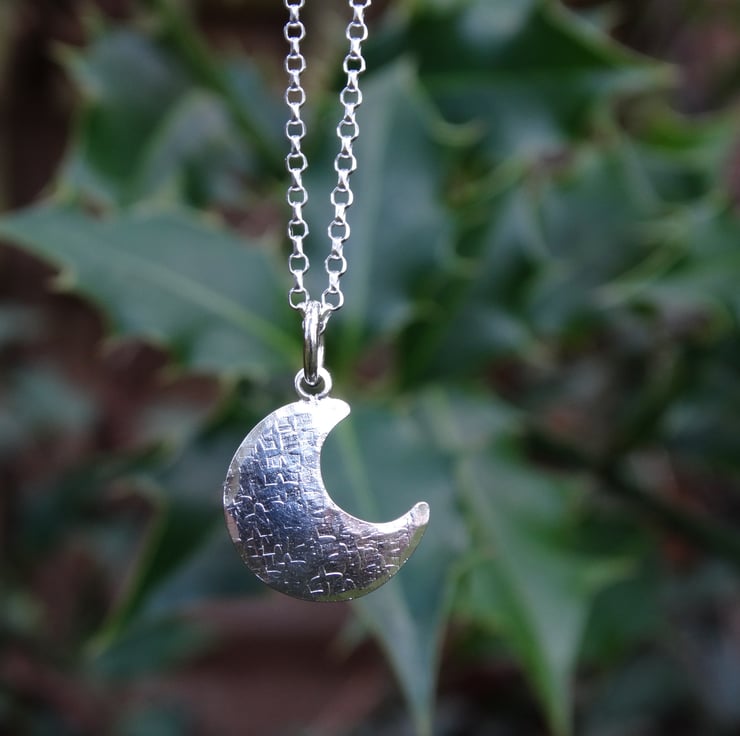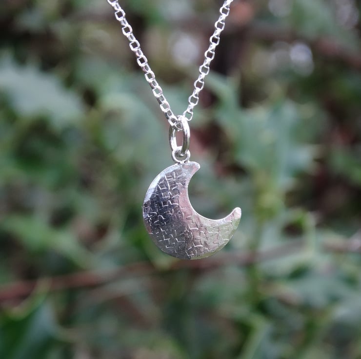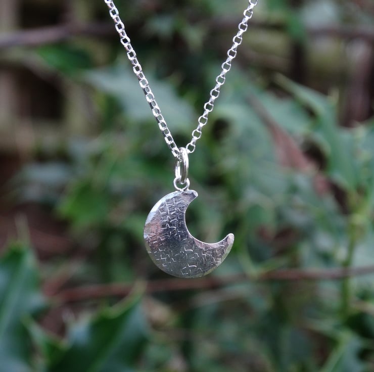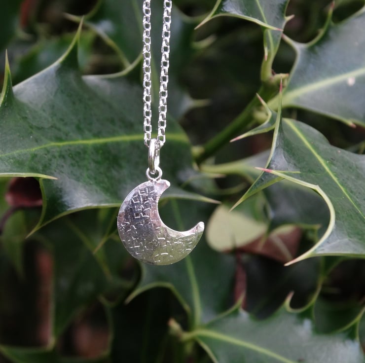This pretty little crescent moon has been hand cut from recycled sterling silver sheet, textured all over in different ways, and hammered gently to give it a very slightly domed finish. It has been polished by hand to give the silver a lovely glow rather than a high shine finish. It hangs on a sparkly diamond cut chain.