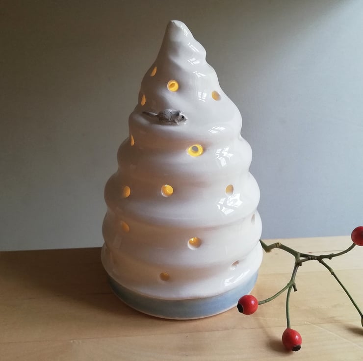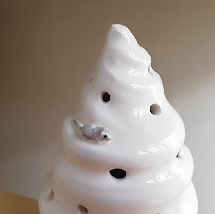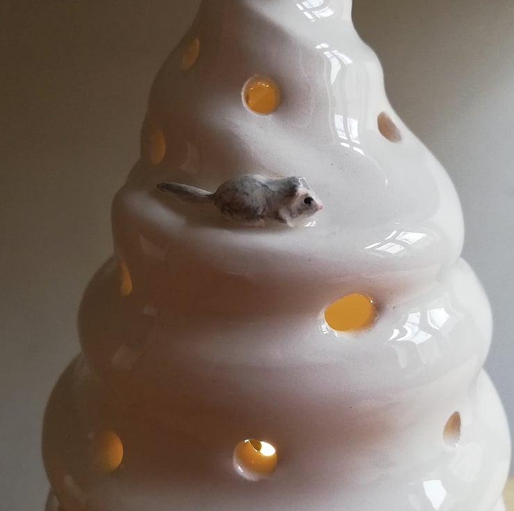 Handmade christmas tree tea light holder with tiny hand painted grey mouse climbing up. Glazed in clear and grey glossy glaze .
