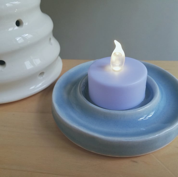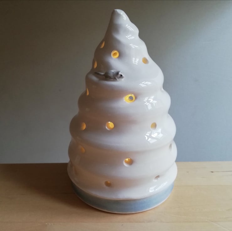 This little tree was thrown on my wheel and the little mouse was modelled and attached. Little holes were punched through the clay to allow light from a tealight candle to shine through. Once bisque fired the piece was hand painted and glazed with lead free glaze before the final firing.