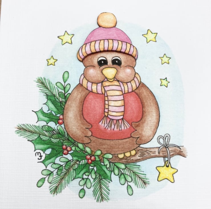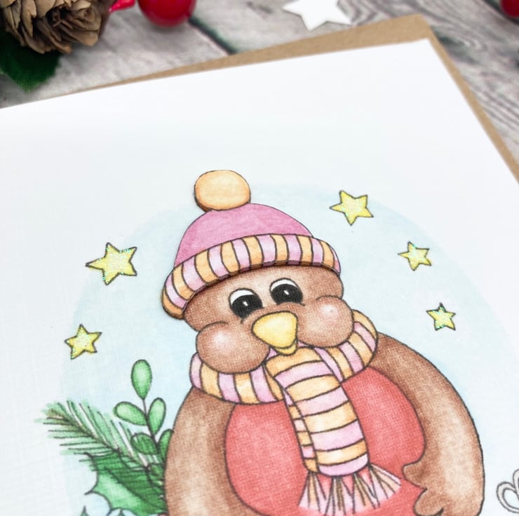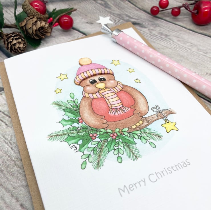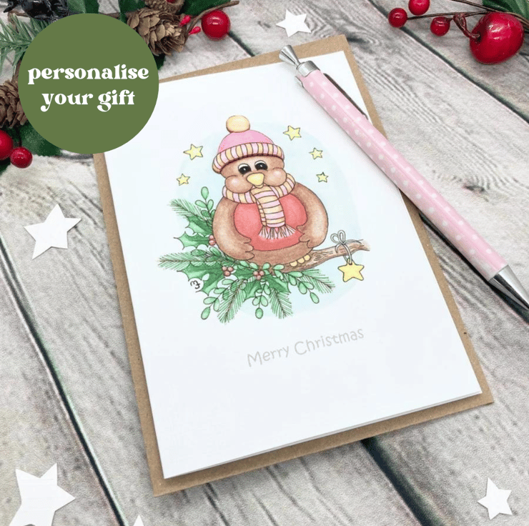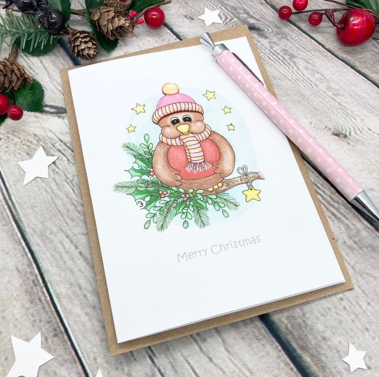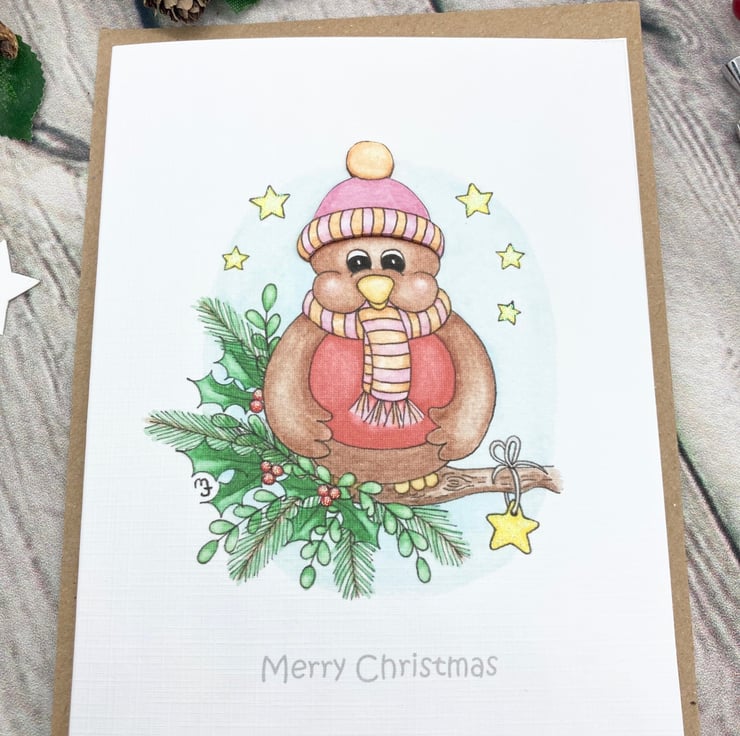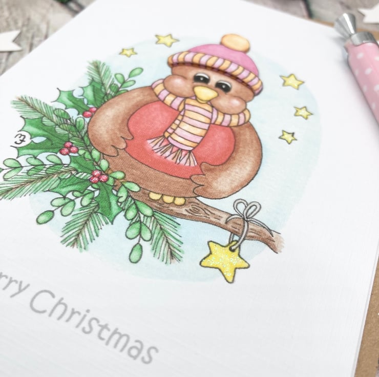 This cute Christmas Robin card has been designed using my own original watercolour illustration. The card has been printed out onto good quality linen embossed card. The card has been decoupaged up in parts and finished off with a little glitter detail.