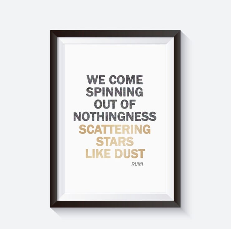 Illustration poster print, Quote by Rumi ' we come spinning out of nothingness, scattering stars like dust'. Black font contains star pattern and gold font contains sand grains.