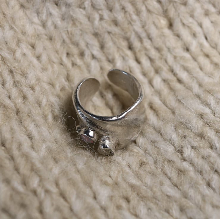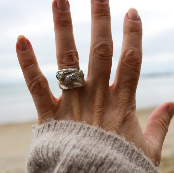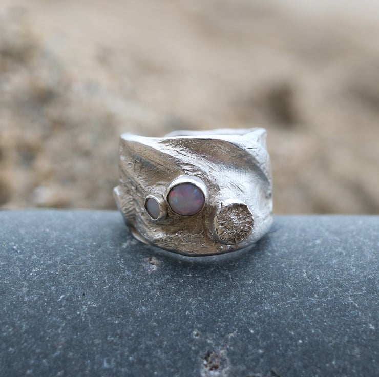 Chunky fine silver ring evoking the deep sea with barnacles and white opals with pretty glints of fire. The ring tapers at the back and is open although very hard to adjust to a different size as it's quite chunky!