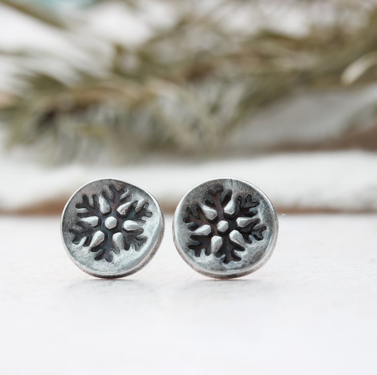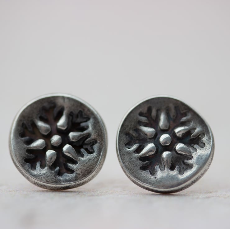 Silver snowflake stud earrings, oxidised finish. These earrings are a sample piece from this year's Christmas collection.