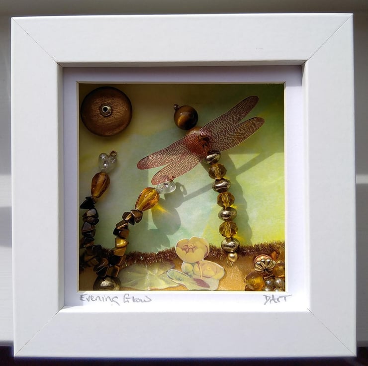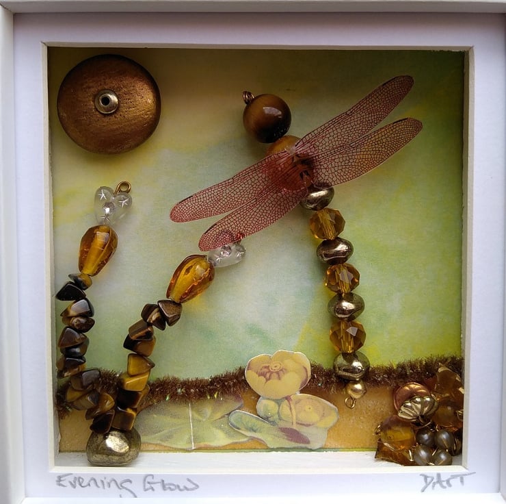 The Golden Hour is a period just before sunset when everything is bathed in a golden glow just like in this mini box frame. The dragonfly, the pond and the foliage are reflecting the last rays of the sun with Tiger's Eye, Czech crystals and golden beads.
