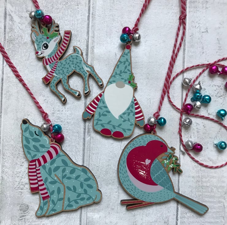 Our printed wooden Christmas decorations are made from responsibly sourced, fast-growing woods.