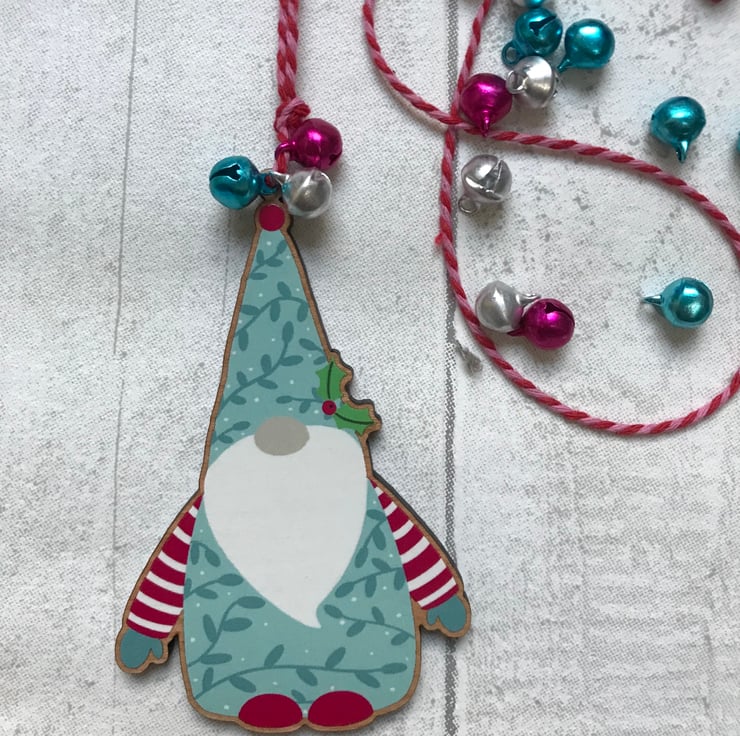 My cute little Gonk wooden Christmas decoration is sure to look at home on any Christmas Tree. Looking really cosy in his turquoise coat sporting a dark turquoise vine print (which matches his hat) with raspberry and white striped sleeves. Hung with a pink and raspberry cotton twine and finished with three bells in silver, turquoise and raspberry.