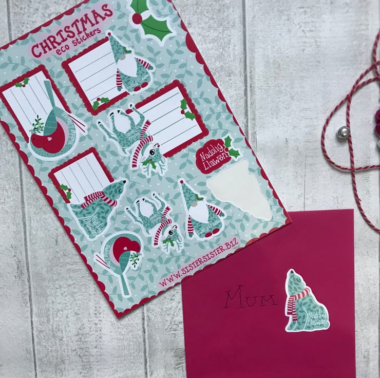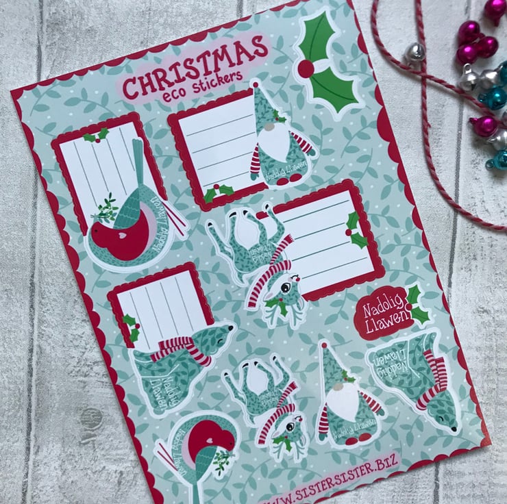 My eco sticker sheets feature 10 stickers to adorn your parcels, Christmas card envelopes, journals etc and feature my cute reindeer, thoughtful Polar Bear, Gonk and Folkart inspired Robin a sprig of holly and a Nadolig Llawen sticker.