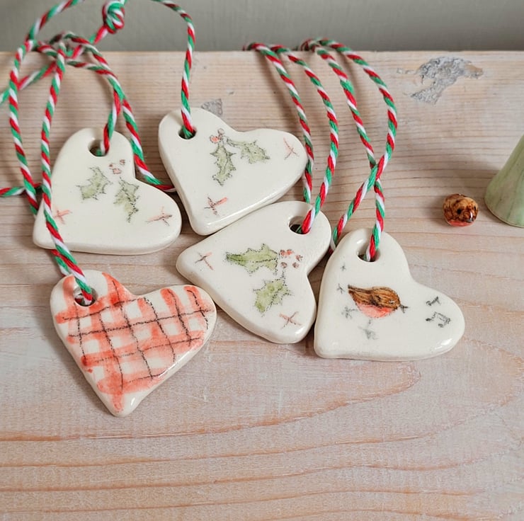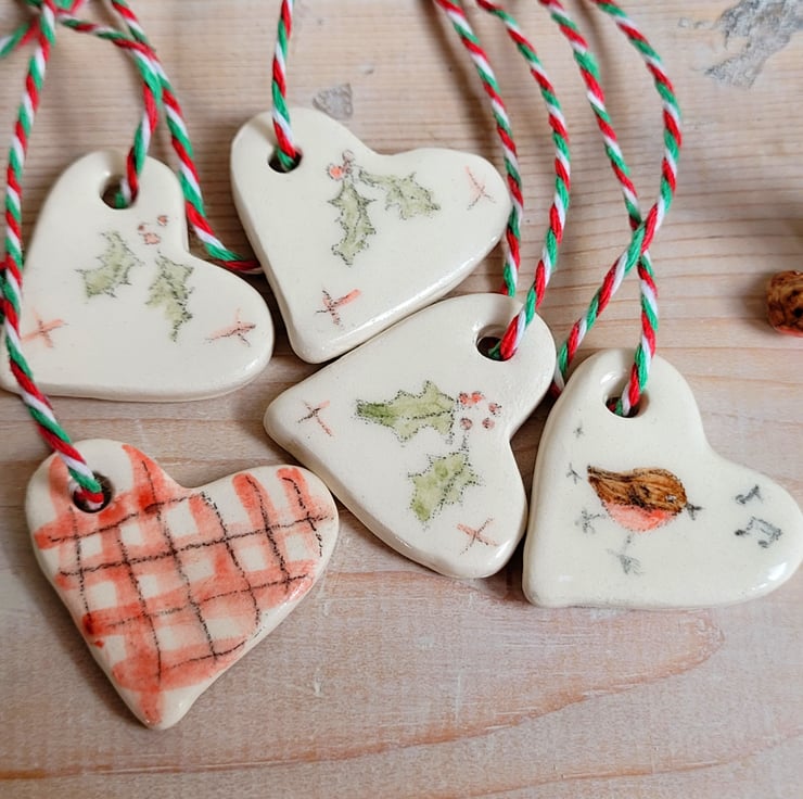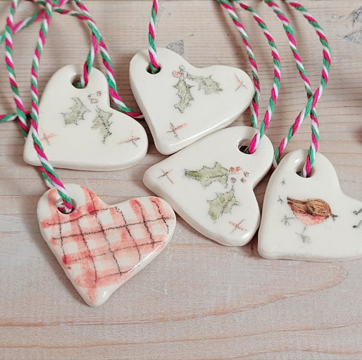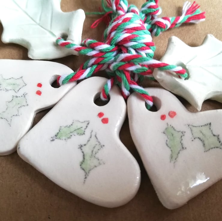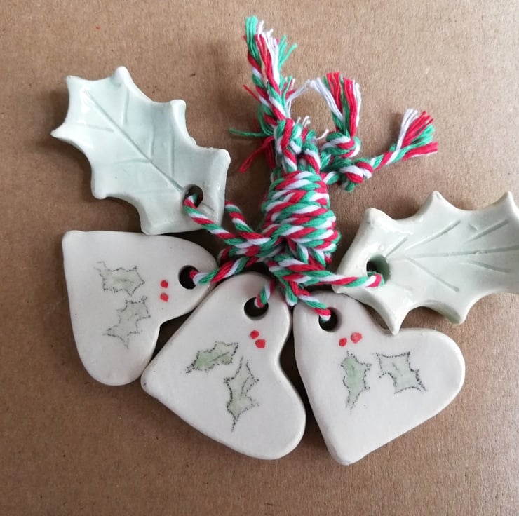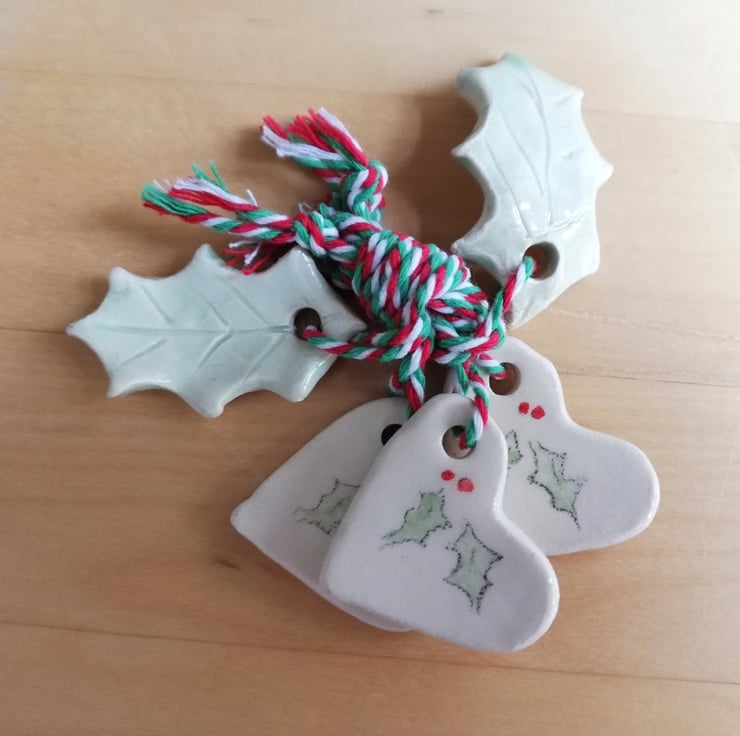 Hand made present toppers a set of 5 (ONLY the set with holly leaves and hearts with holly left) gift tags with 3 colour twine . You can write on the back with a permanent marker or pencil.
