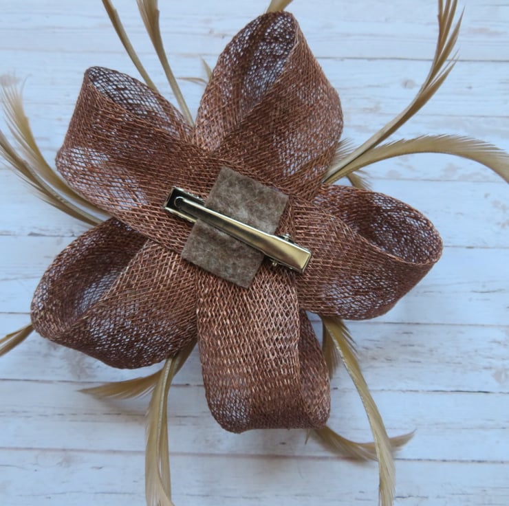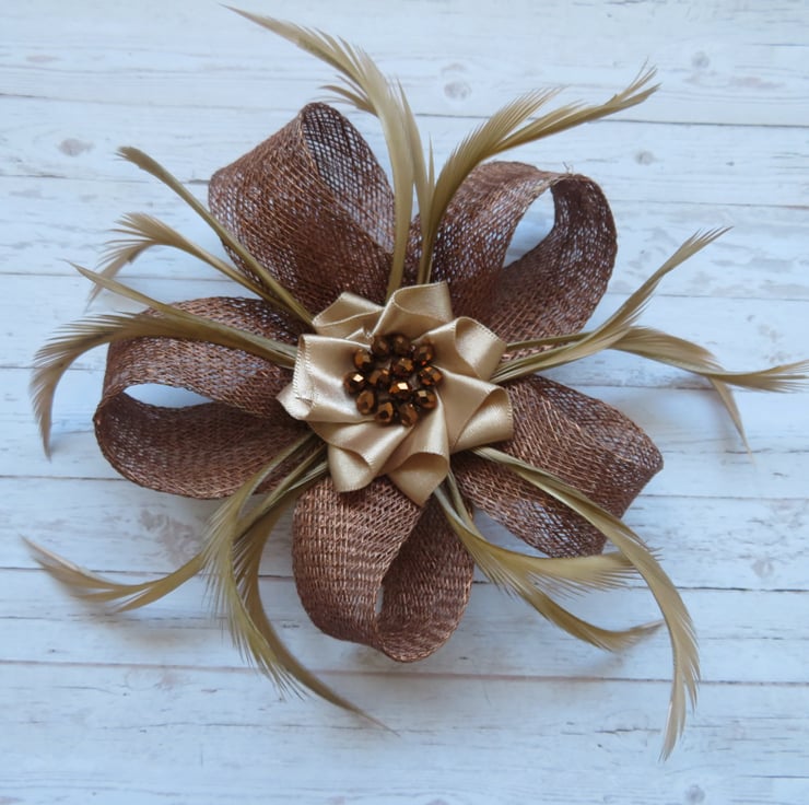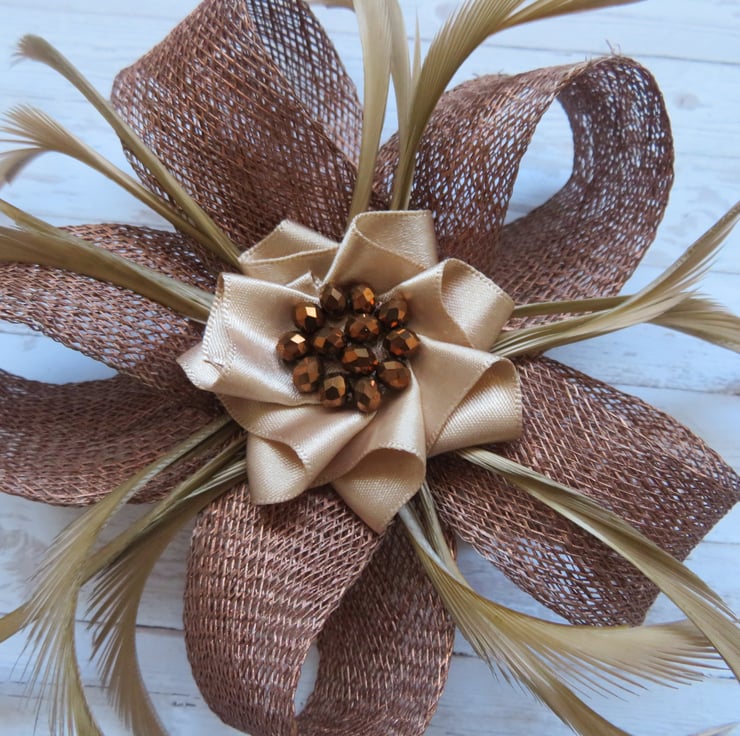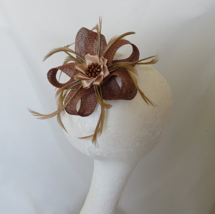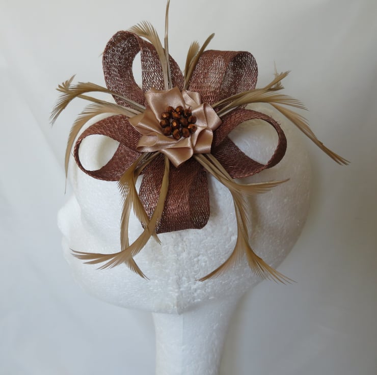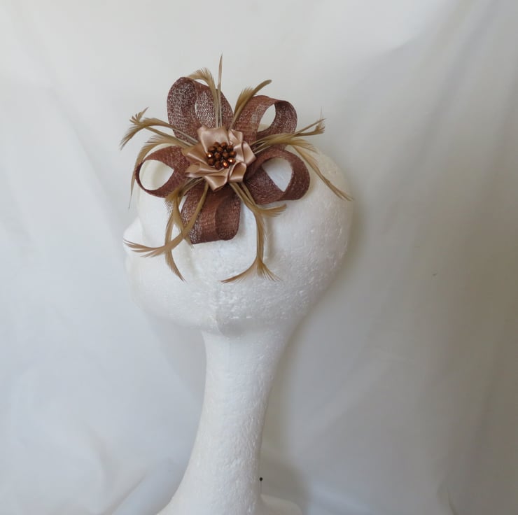 This is an attractive and eye catching sinamay loop fascinator in shades of copper, bronze and beige.