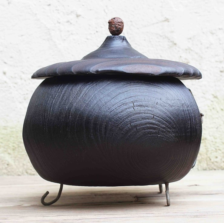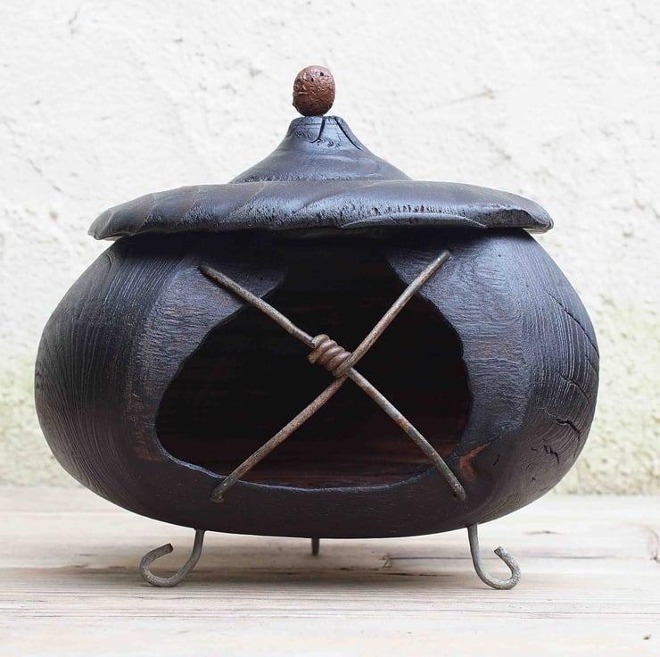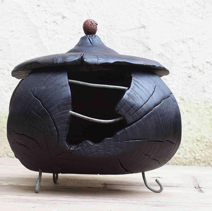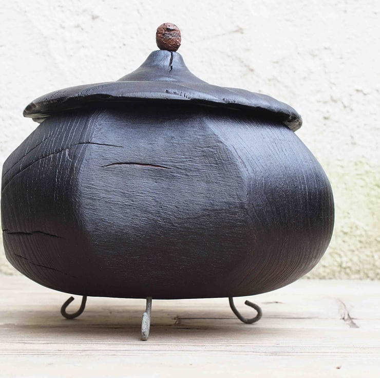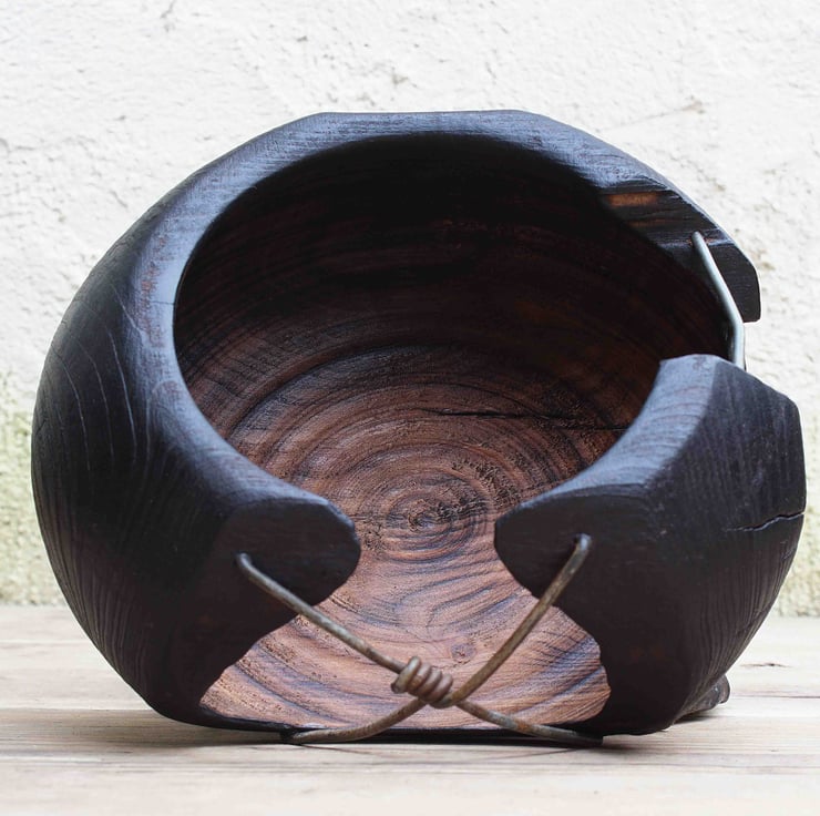 The first vision was a hollow form, then it fell off the lathe and broke, and I just couldn`t throw it away. After sitting in the workshop for a few months, one day it just materialized into this unique wabi sabi style bowl. This rustic wooden bowl has been scorched according to the Shou Sugi Ban Japanese technique.