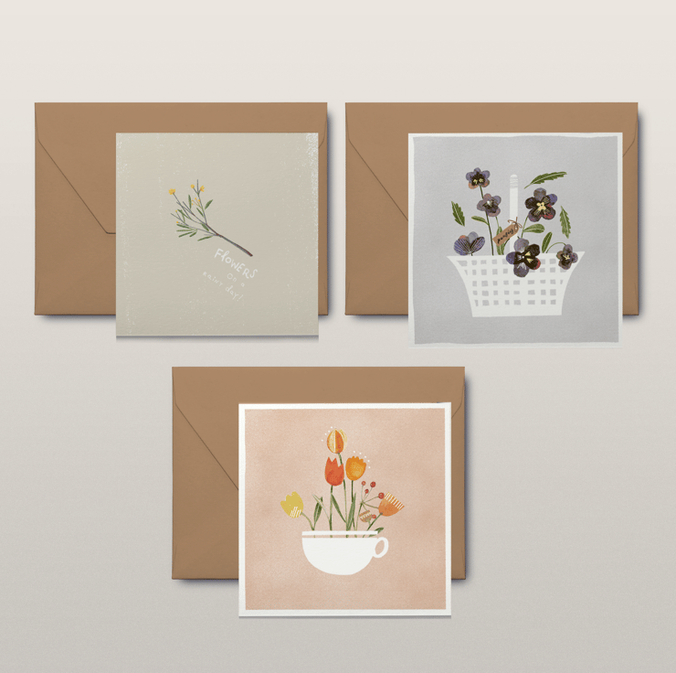 Basket of pansies, single fold square greeting card 100mm printed on recycled cardstock. Packed in compostable sleeve with recycled envelope. Original digital illustration by After Providence.