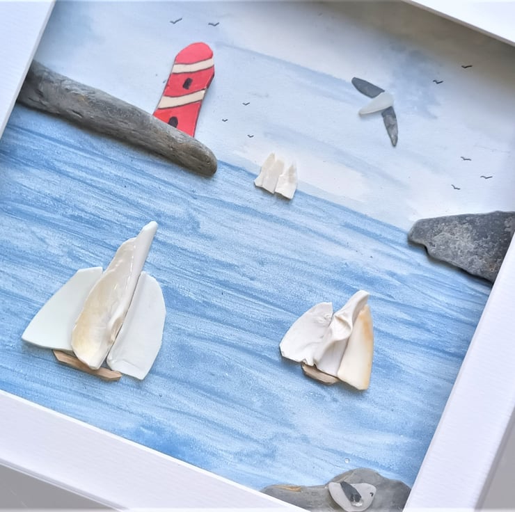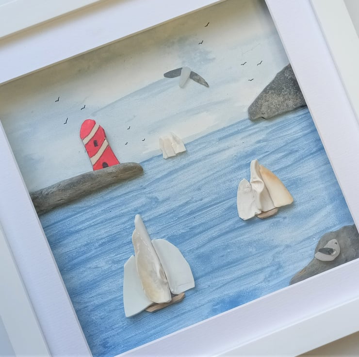 Tall ships created from Cornish sea shells passing a sea pottery lighthouse.