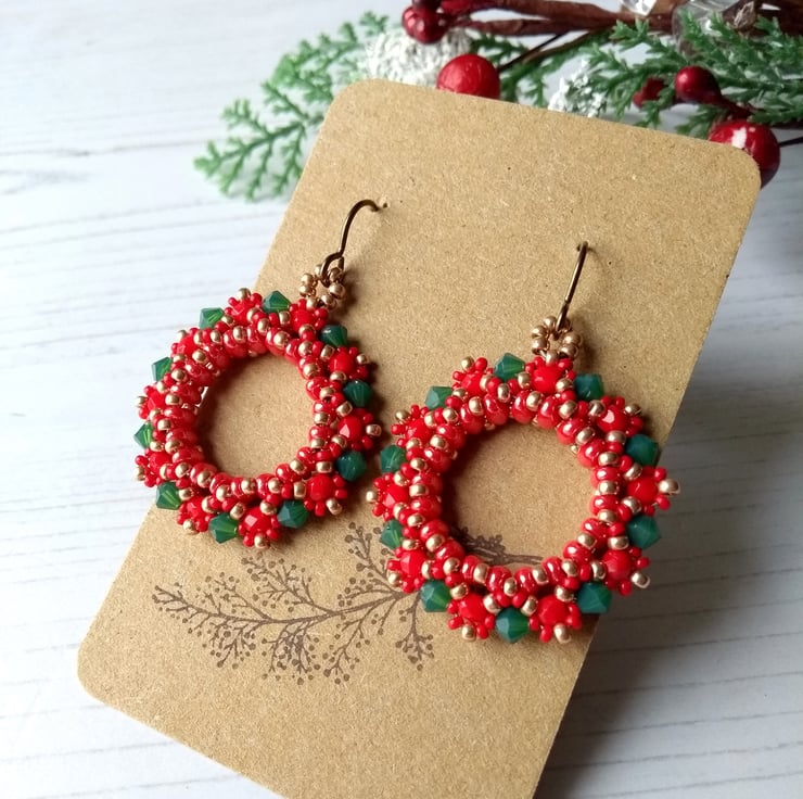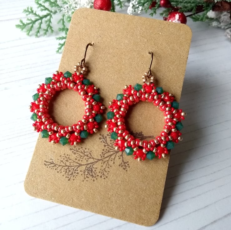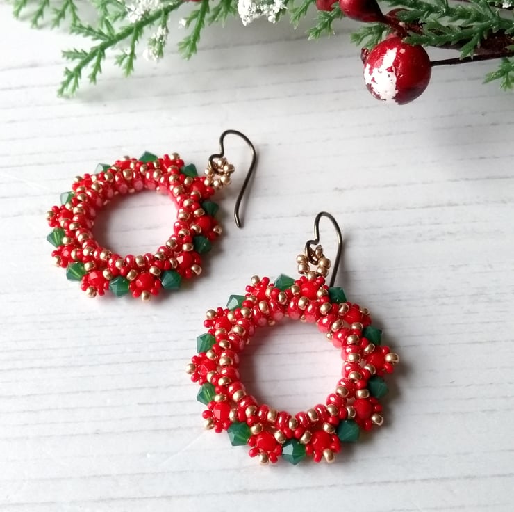 Beautiful crystal and glass seed bead earrings hand-woven with just a needle and thread. These wreath style earrings are perfect for the festive season - this pair, in particular, remind me of poinsettias!