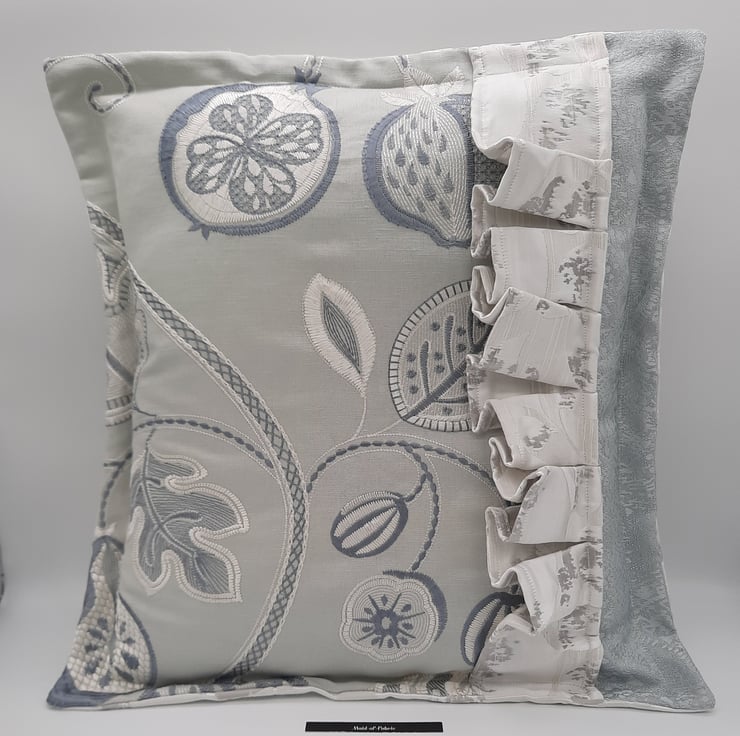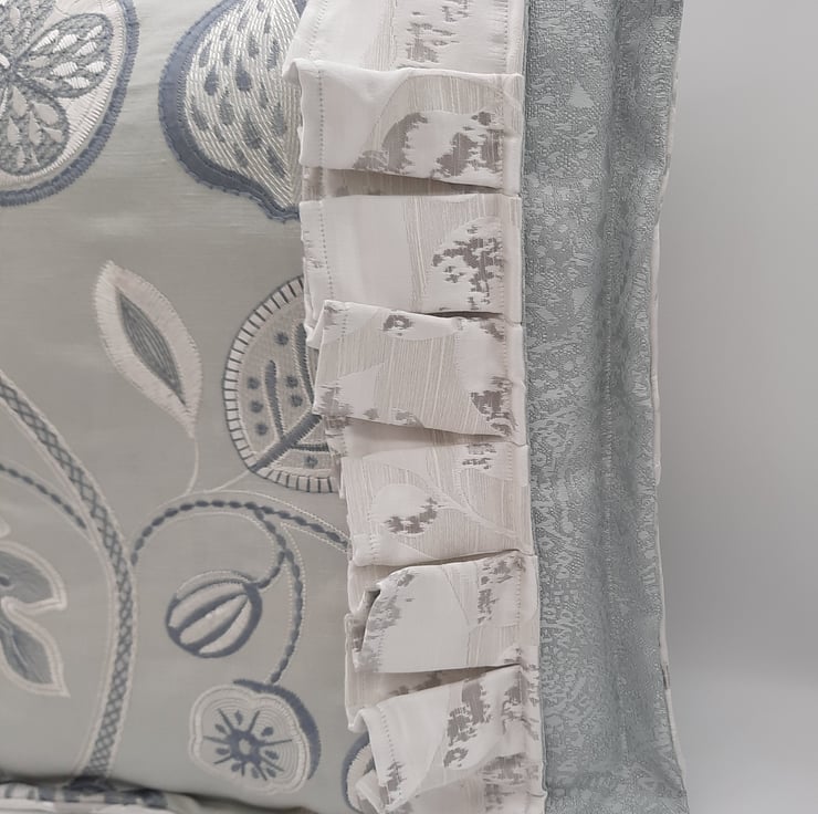 I've used 3 fabrics to make this piece. A pale green embroidered fabric. A deeper pale green for the side pannel and a contrasting white pattern fabric.