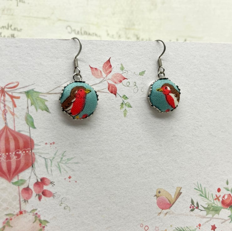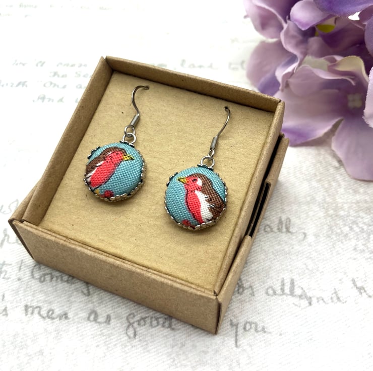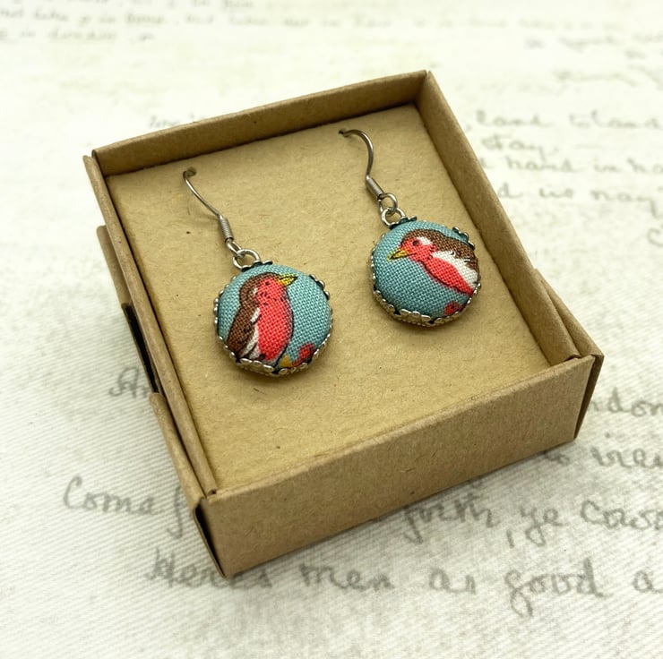 Created from Liberty print fabric, these earrings feature a pair of robins, facing each other and made by me into 15mm fabric buttons.