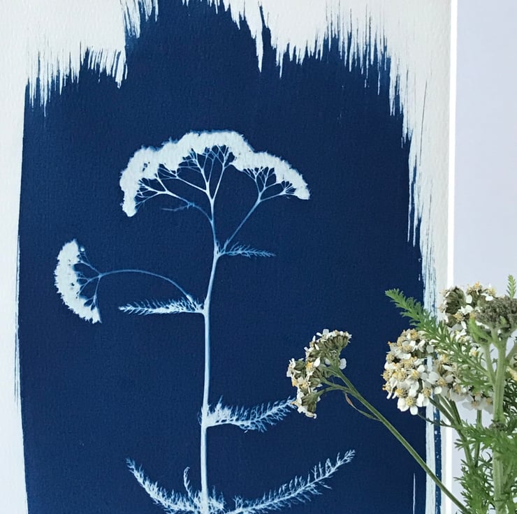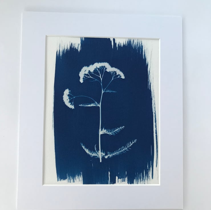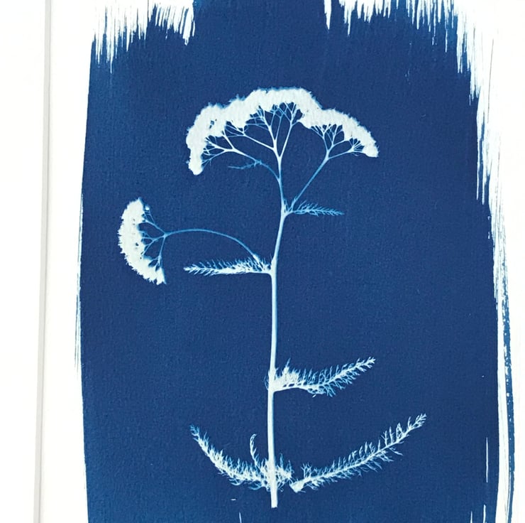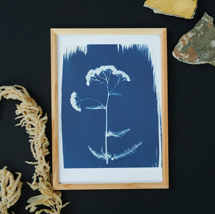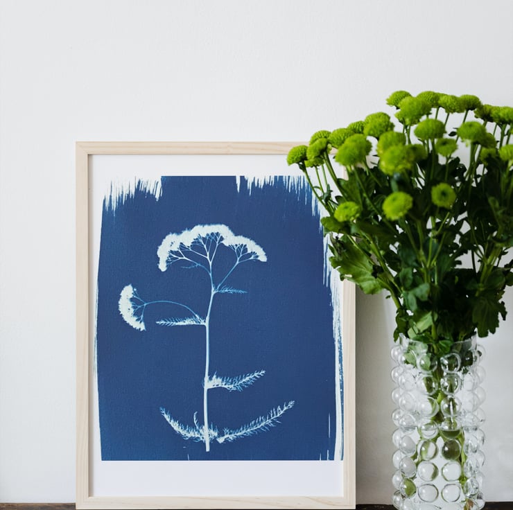 A contemporary look for this Achillea millefolium or common Yarow, in this Traditional Cyanotype Photogram. Prussian Blue highlights the flat-topped umbrella-like flowers and pinnate leaves beautifully. What a lovely gift for someone you love, or a treat for your home.