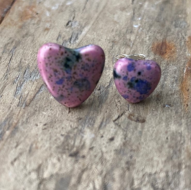 Handmade Ceramic Mismatched Heart Earrings. These fabulous earrings have been hand formed from Earthenware Clay. Glazed in a Beautiful Purple Glaze with Bursts of Blue and Black and real depth.