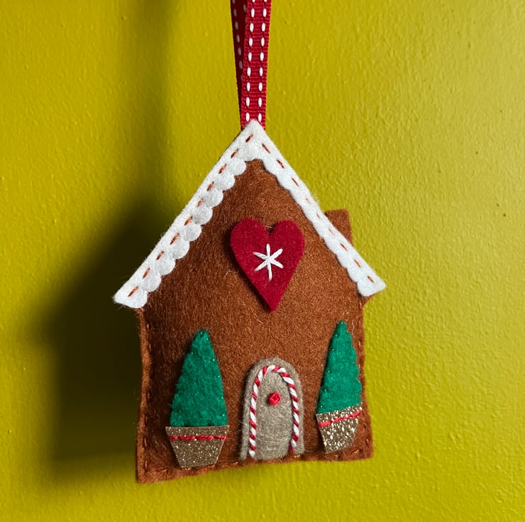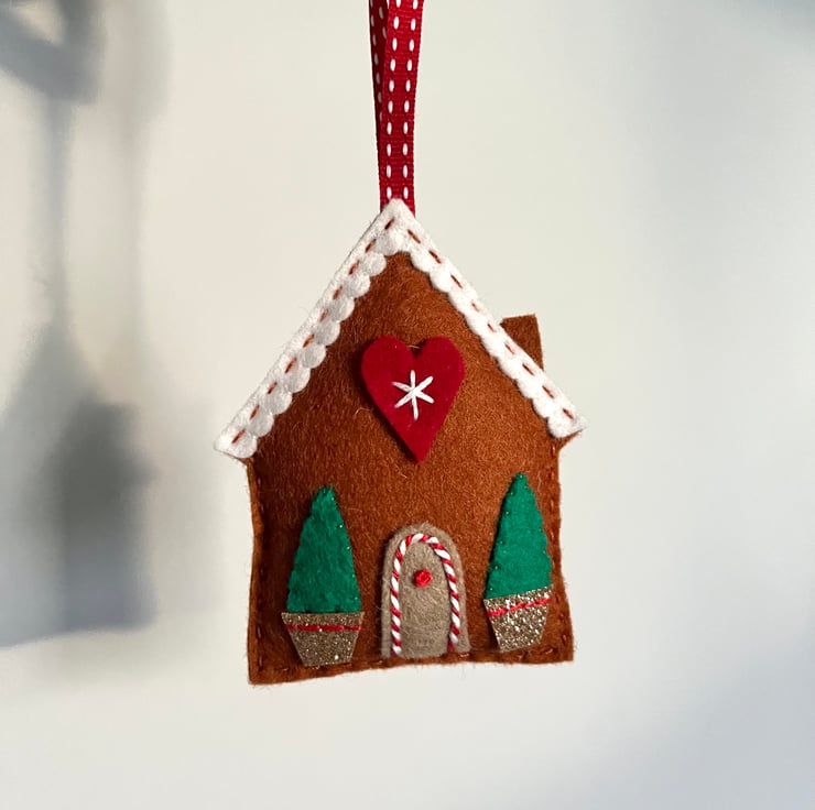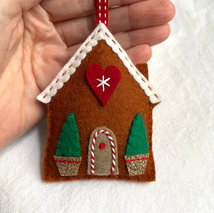 The gingerbread house is made from 100% wool felt, which is soft and strong. The details such as doors and the snowy roof are added with appliqué and hand stitched into place with embroidery thread. The house hangs from a red checked ribbon. A small appliqué heart is the finishing touch, making this tree decoration a sweet gift for a loved one.
