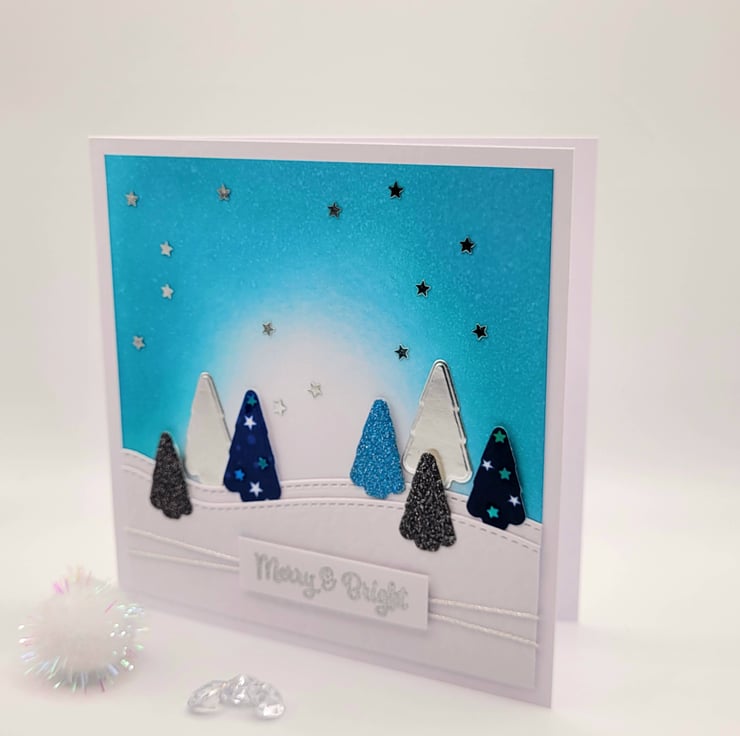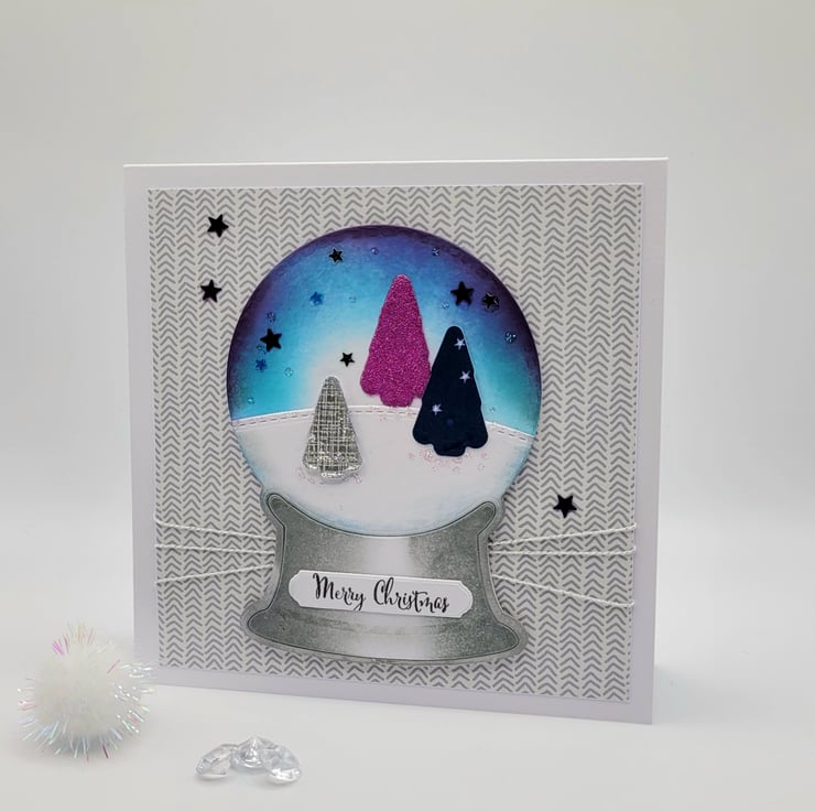 The snow globe has a tiny label stamped with MERRY CHRISTMAS in scripty font, soft grey patterned card background and silver thread decoration. The other card in the set has snowy hills, trees, silver thread and a heat embossed simple sentiment in silver reading MERRY AND BRIGHT. Lots of little stars decorate the cards and the trees are die cut from different patterned card, non-shedding glitter card and silver card for texture.
