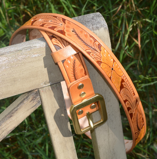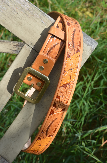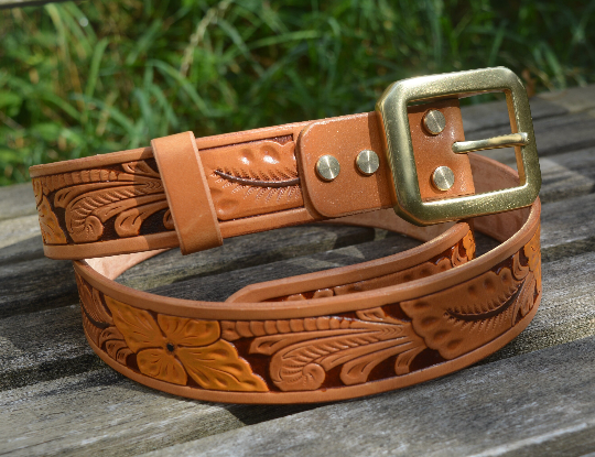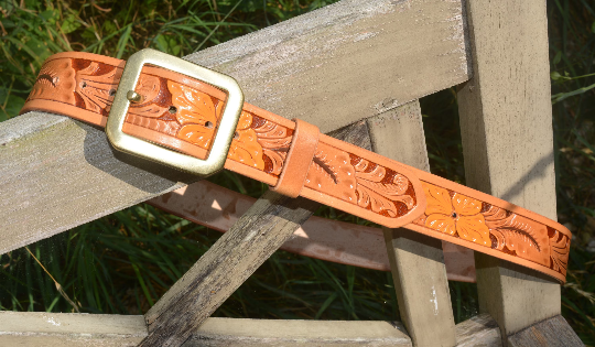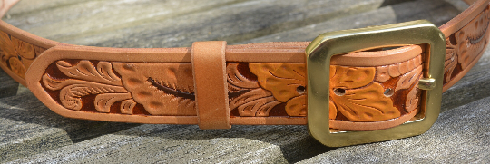 This is a lovely solid embossed-leather western-style belt, 3.5mm thick vegetable-tanned leather, with a heavy solid brass buckle.