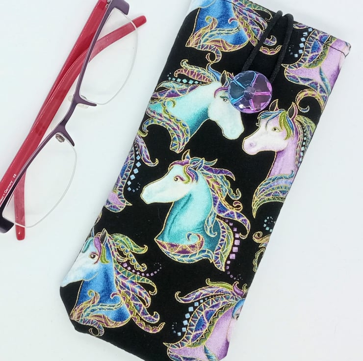 It has a gorgeous two tone button that complements the pattern, and a loop closure to keep your glasses secure.