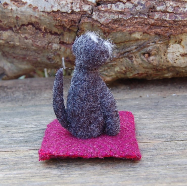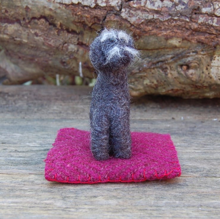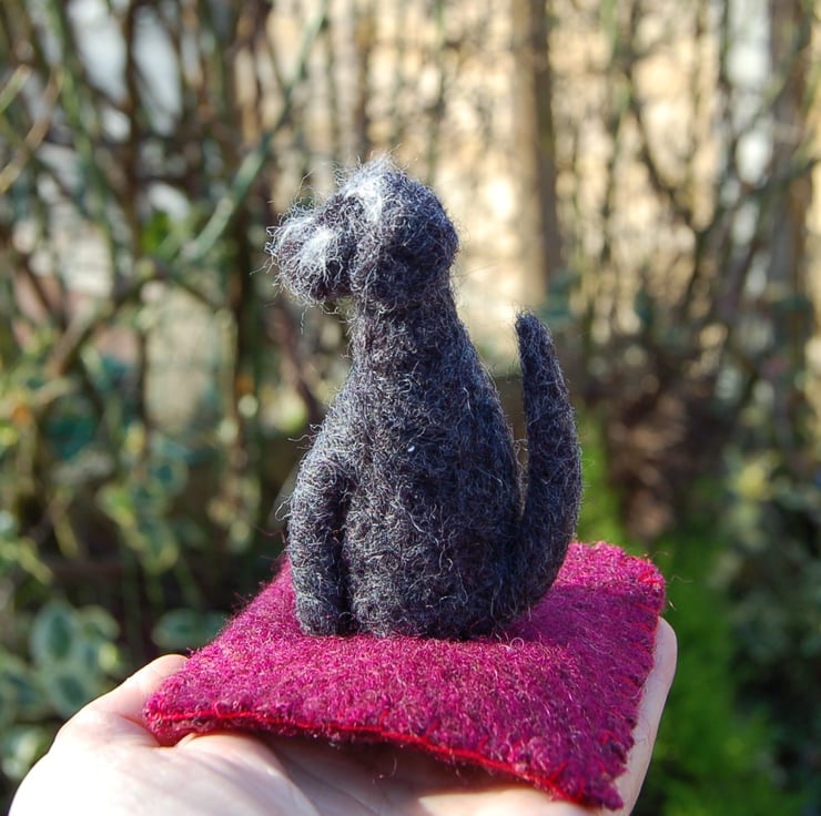 I have made this dog using wool fibres needle felted into shape. The rug is a new piece of wool blanket woven in Yorkshire, folded double with a piece of vintage blanket in between then hand stitched closed with blanket stitch. The dog is sewn onto this and it makes a lovely soft 'bed'.