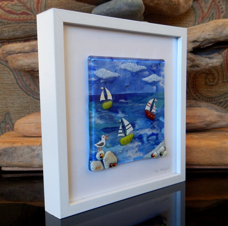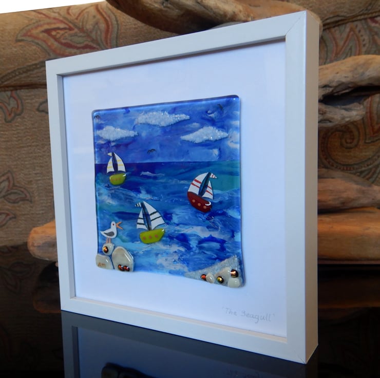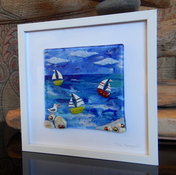 'Seagull' is made completely from glass which has been fused in my kiln. There is no enamel, glass paint or any other materials used, this picture is 100% pure bullseye fusing glass!