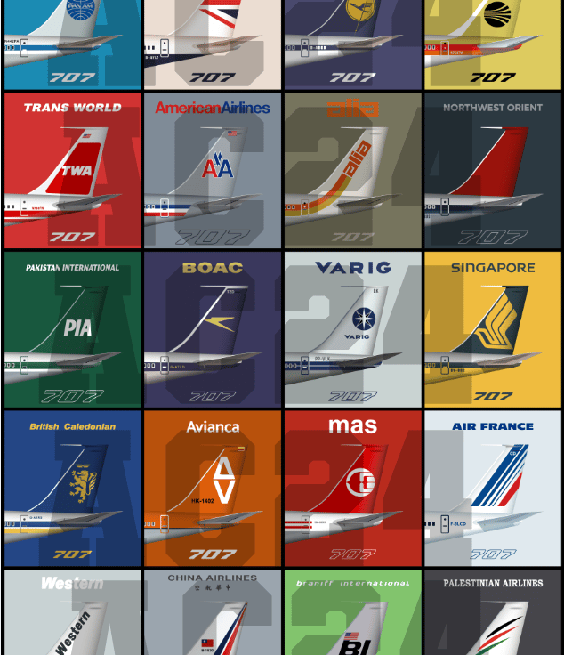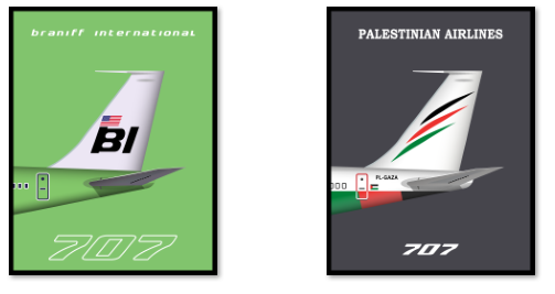 Retro Vintage BOEING 707 Aircraft Tail Posters With Airline Livery Designs - in A4 and A3 sized print only.