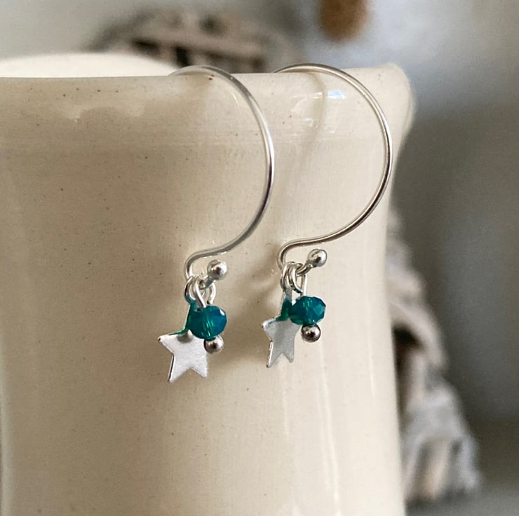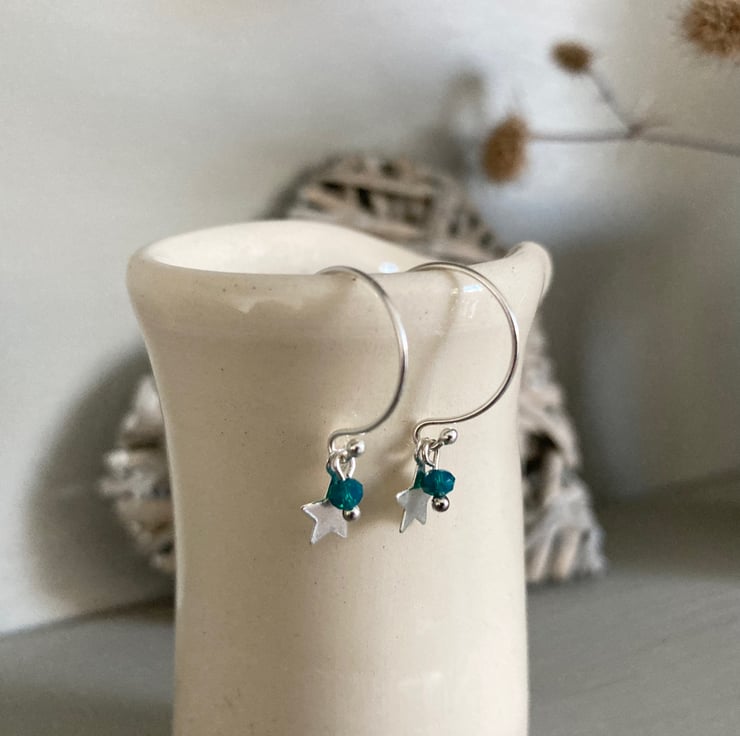 Pretty little half-hoop earrings made with a tiny teal faceted bead and a silver plated star on sterling silver earring half-hoops. The earrings come with a plastic earring stopper at the back to keep the hoop safely in your ear. The hoops are approximately 15mm in diameter.