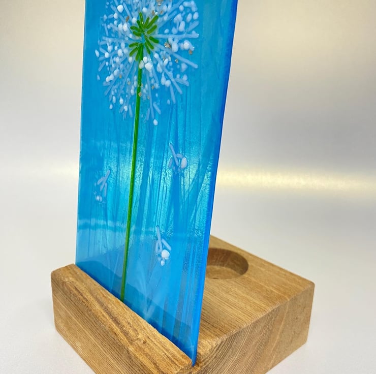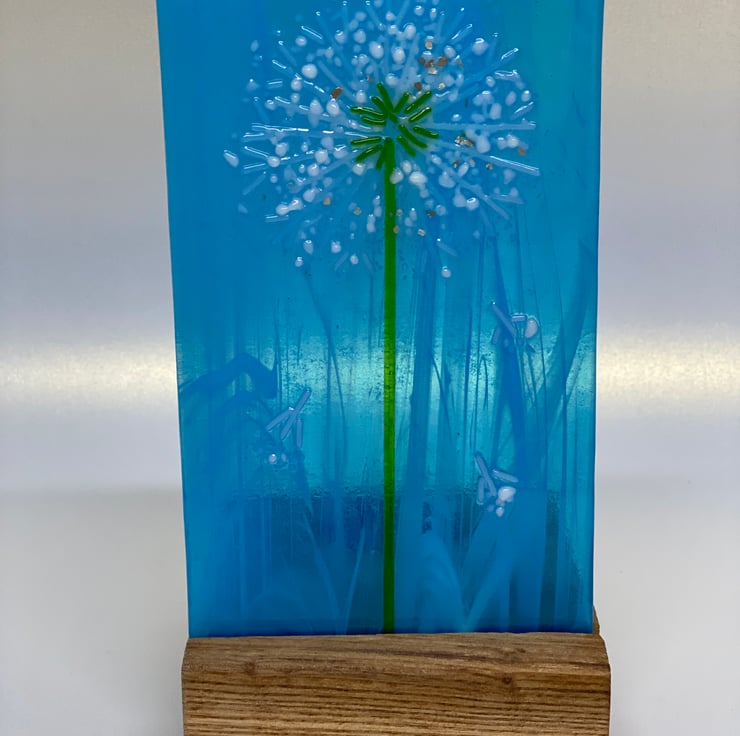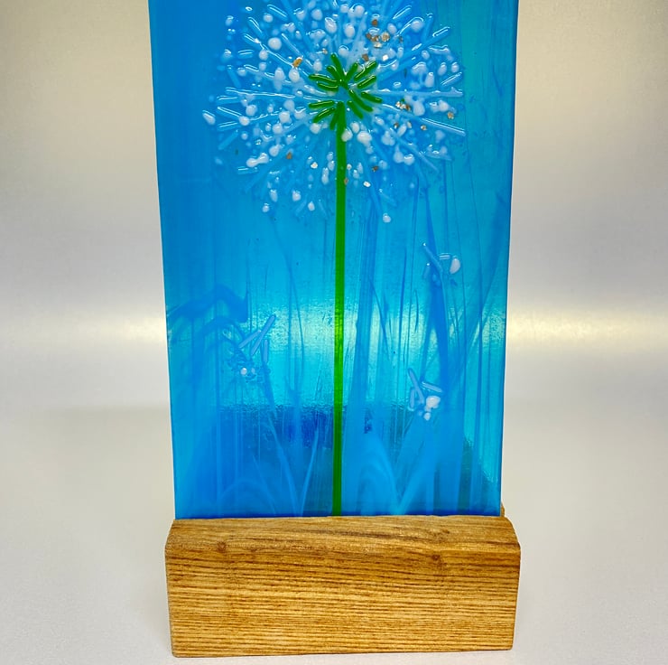 Gorgeous wispy blue glass mimics the sky with delicate glass dandelion and a touch of silver .