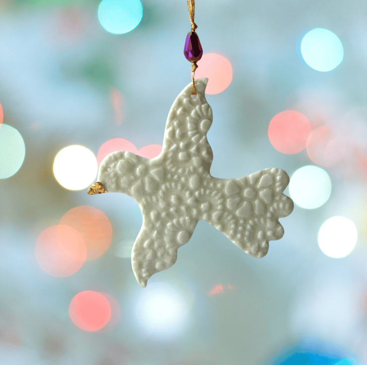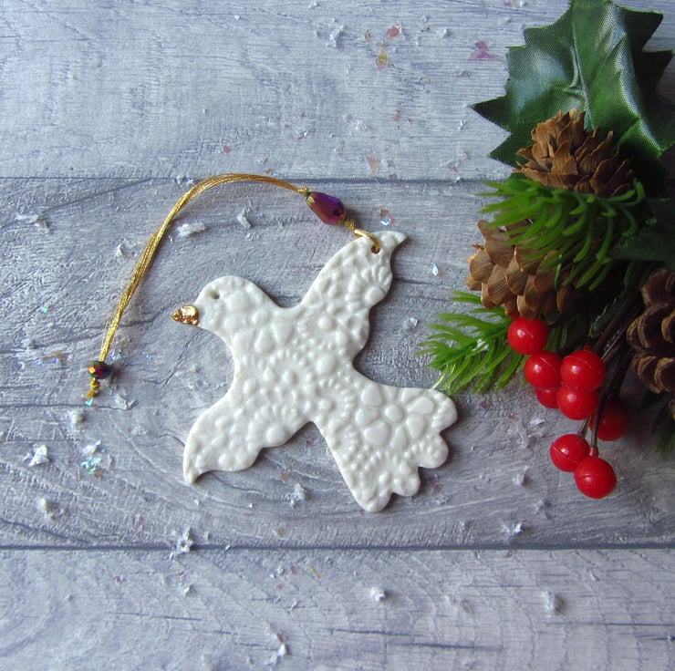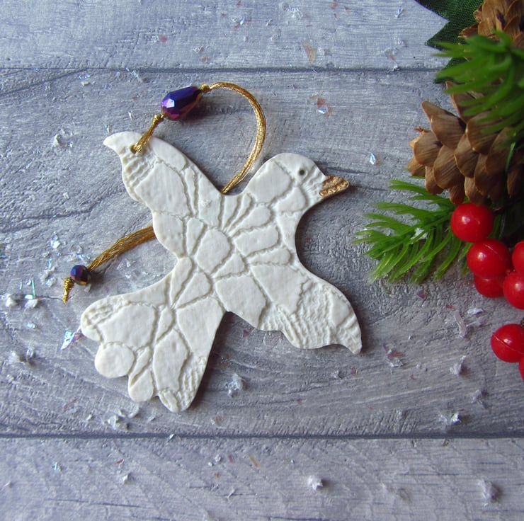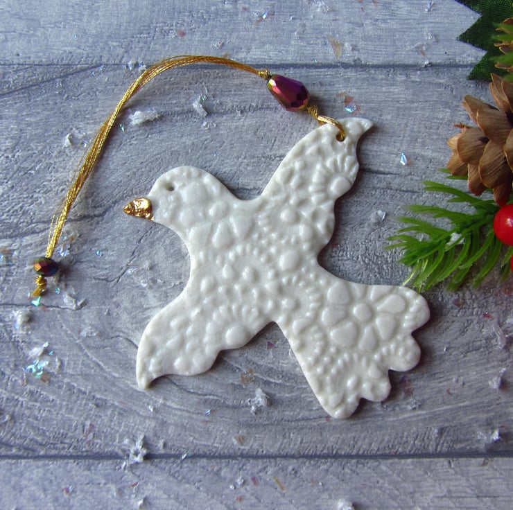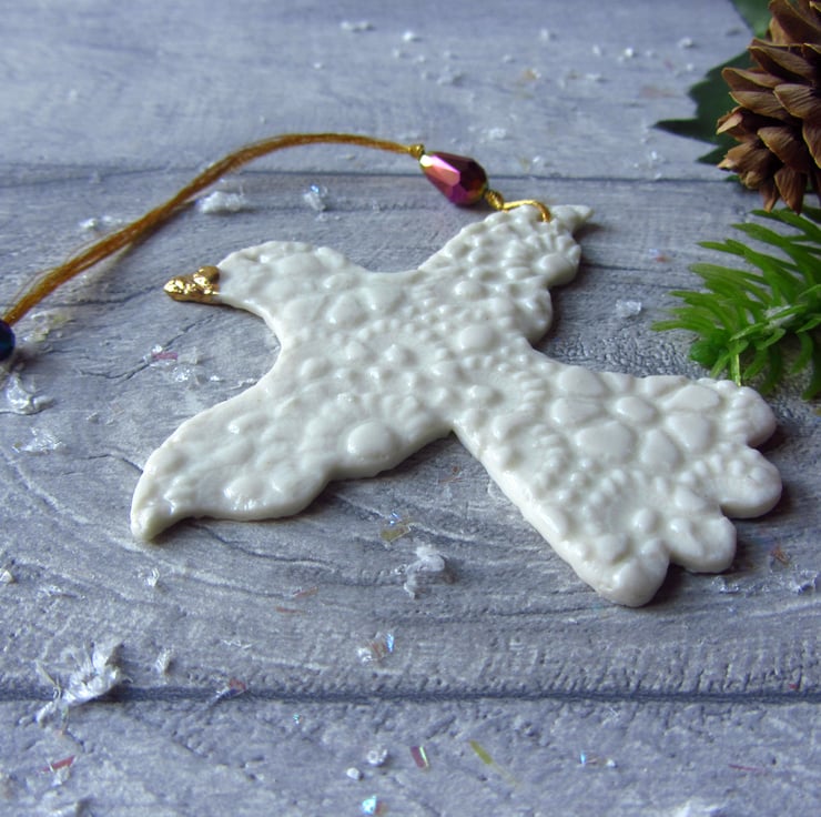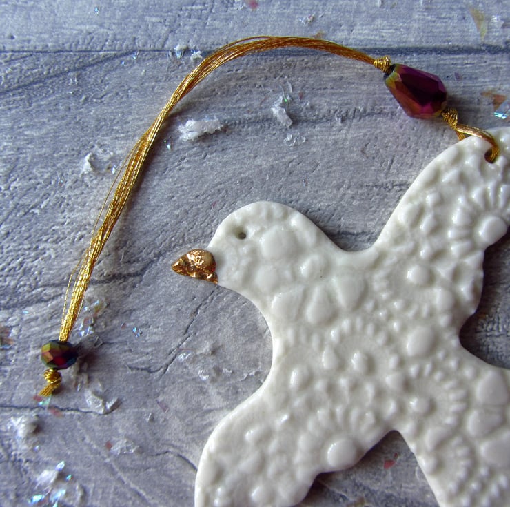This is a fine porcelain bird with outstretched wings, that has been imprinted on both sides with lace, before going through its first firing. It is then glazed, and has its second firing. Finally, each decoration is hand painted with gold lustre to give a high shine finish and goes through a third and final firing.
