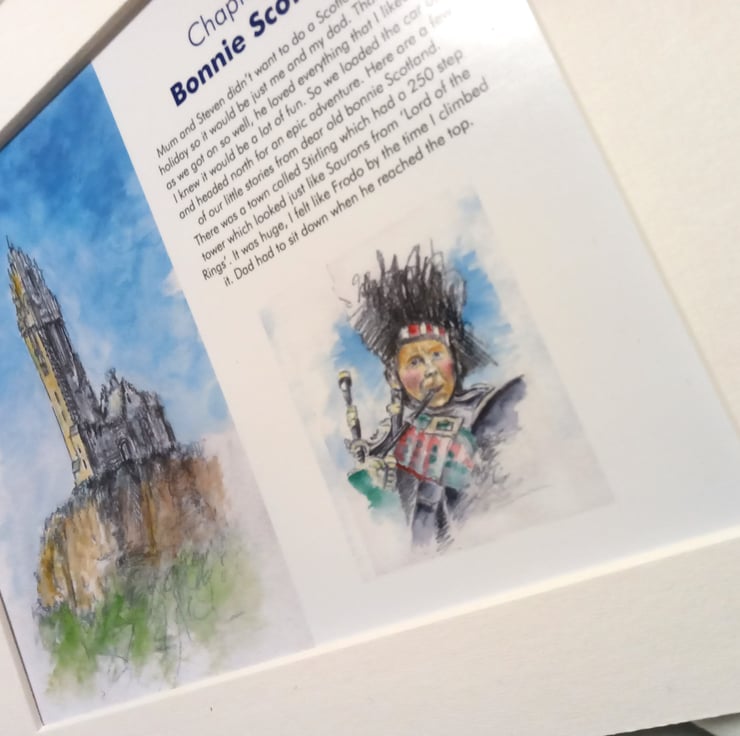 Original hand painted watercolour illustration fine art print painting of Stirling Tower Scotland, with a story for charity. 'Every picture tells a story'. Presented and signed in a mounted Grey wooden frame with a grain finish 10" x 8" (print: 8" x 6") 22mm wide and 22mm deep. Also presented unframed, fully mounted ready for your own frame. (10" x 8" Mount-Print 8" x 6")