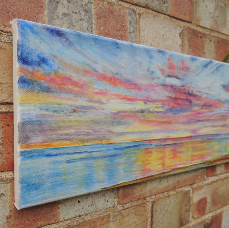 This canvas is 8 x 20 x 0.5 inches and is painted using professional oil paints