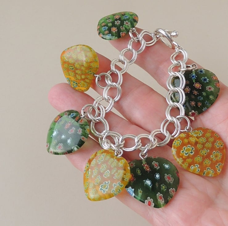 This pretty hearts bracelet has green and yellow glass millefiori hearts on a double link silver plated bracelet.