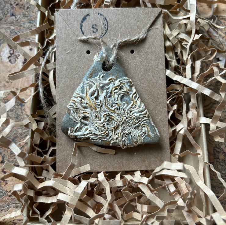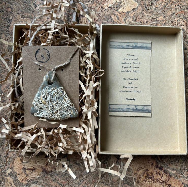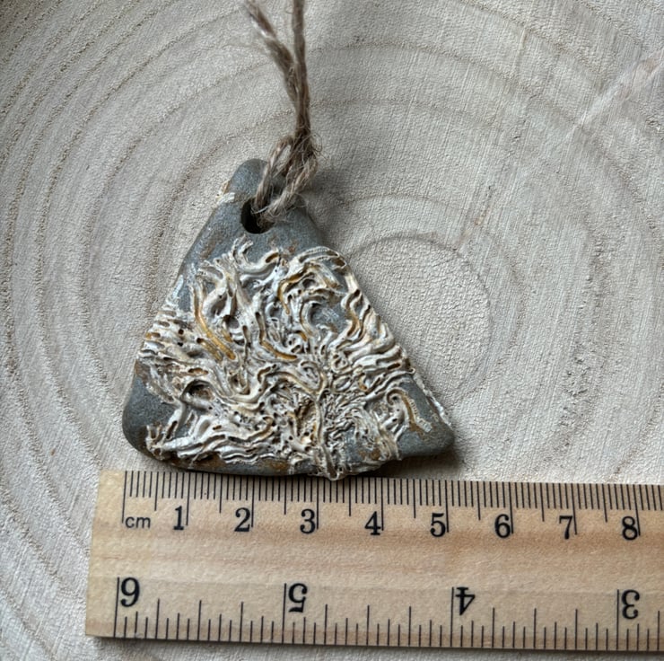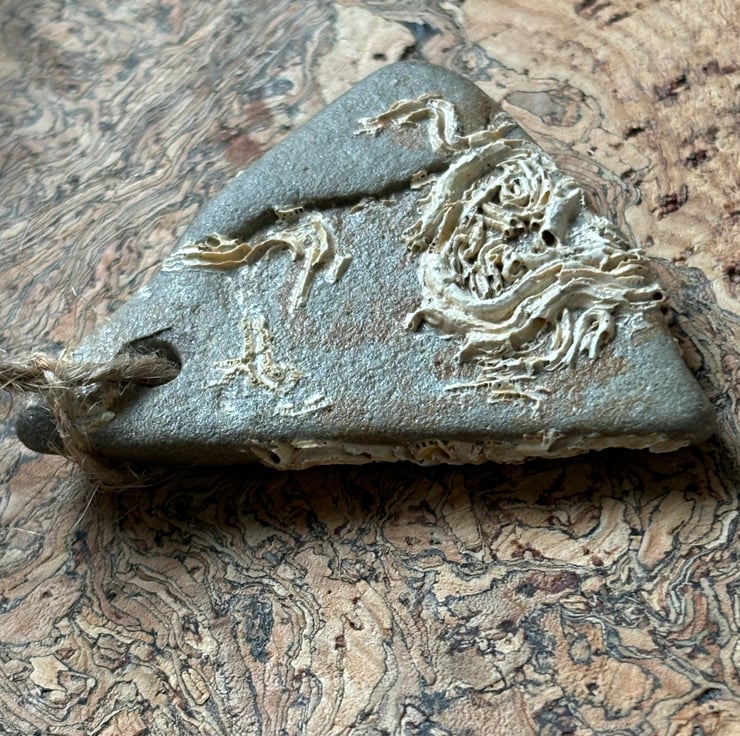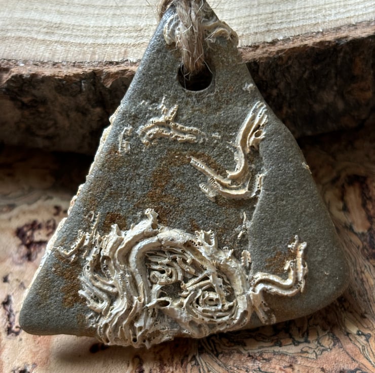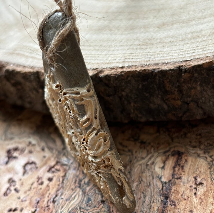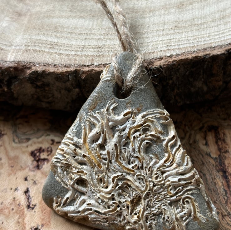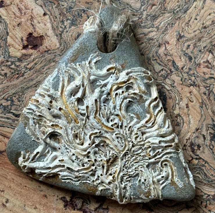 Here I found some interesting bits and my favourite, stones covered in worm castings. I’m not keen on the word ‘worm’ so called them the casting stones. The patterns left by the worms are fascinating, varied and unique. This stone is exactly how I found it, all I’ve done is drilled a hole and sealed it with a non toxic eco friendly gloss. Although gloss, the finish isn’t highly shiny, the stone has absorbed the sealant which give it an attractive slight satin finish.