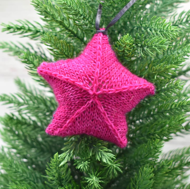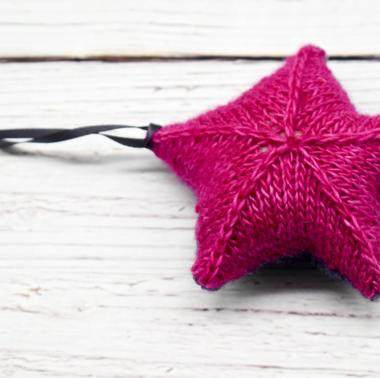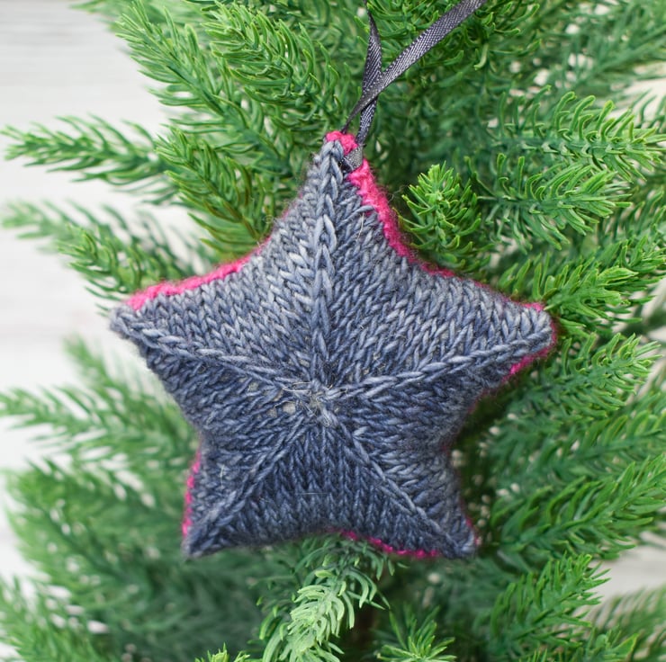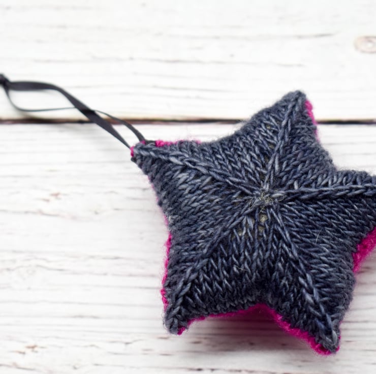 This is a lovely little 5 pointed star, knitted in pink yarn on one side and grey on the other then stuffed with toy grade wool stuffing which conforms to EN71, BS1425, BS5852. The star is finished with grey ribbon to hang.